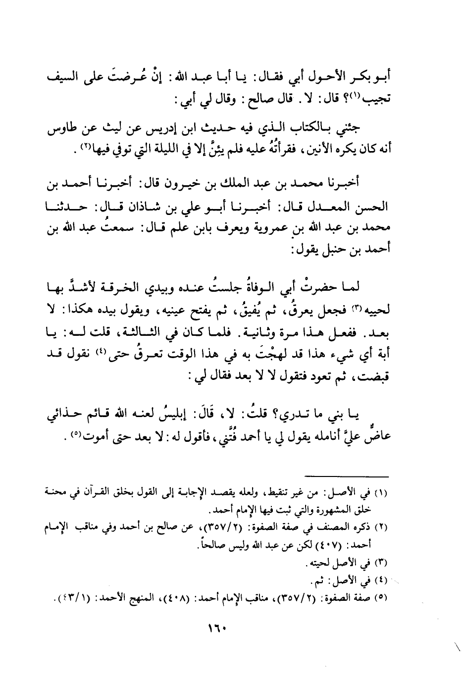 يَا بُنَيَّ مَا تَدْرِي قُلْتُ لَا قَالَ إِبْلِيسُ لَعَنَهُ اللَّهُ قَائِمٌ حِذَائِيِ عَاضٌّ عَلَى أَنَامِلِهِ يَقُولُ لِي يَا أَحْمَدُ فُتَّنِي فَأَقُولُ لَهُ لَا بَعْدُ حَتَّى أَمُوتَ