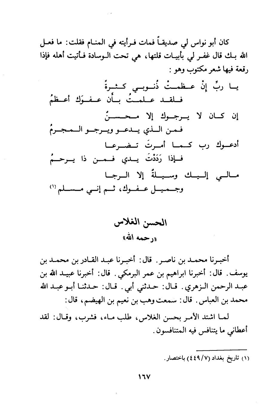 كَانَ أَبُو نُوَاسُ لِي صَدِيقًا فَمَاتَ فَرَأَيْتُهُ فِي الْمَنَامِ فَقُلْتُ مَا فَعَلَ اللَّهُ بِكَ قَالَ غَفَرَ لِي بِأَبْيَاتٍ قُلْتُهَا هِيَ تَحْتَ الْوِسَادَةِ فَأَتَيْتُ أَهْلَهُ فَإِذَا رُقْعَةٌ فِيهَا شِعْرٌ مَكْتُوبٌ وَهُوَ ... يَا رَبِّ إِنْ عَظُمَتْ ذُنُوبِي كَثْرَةً ... فَلَقَدْ عَلِمْتُ بِأَنَّ عَفْوَكَ أَعْظَمُ