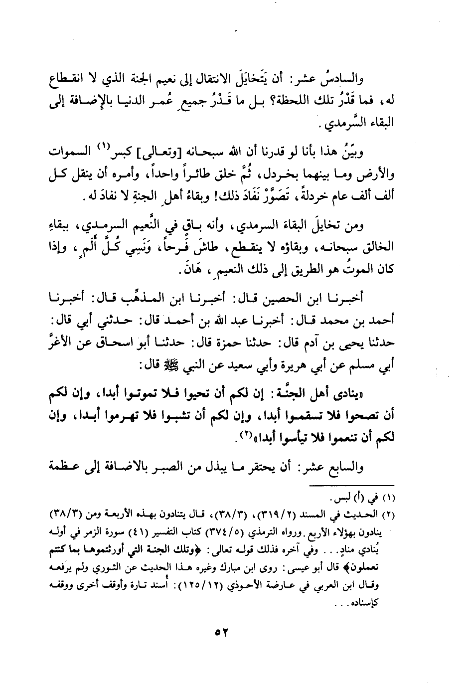 يُنَادَى أَهْلُ الْجَنَّةِ إِنَّ لَكُمْ أَنْ تَحْيَوْا فَلا تَمُوتُوا أَبَدًا وَإِنَّ لَكُمْ أَنْ تَصِحُّوا فَلا تَسْقَمُوا أَبَدًا وَإِنَّ لَكُمْ أَنْ تَشِبُّوا فَلا تَهْرَمُوا أَبَدًا وَإِنَّ لَكُمْ أَنْ تَنْعَمُوا فَلَا تيأسوا أَبَدًا