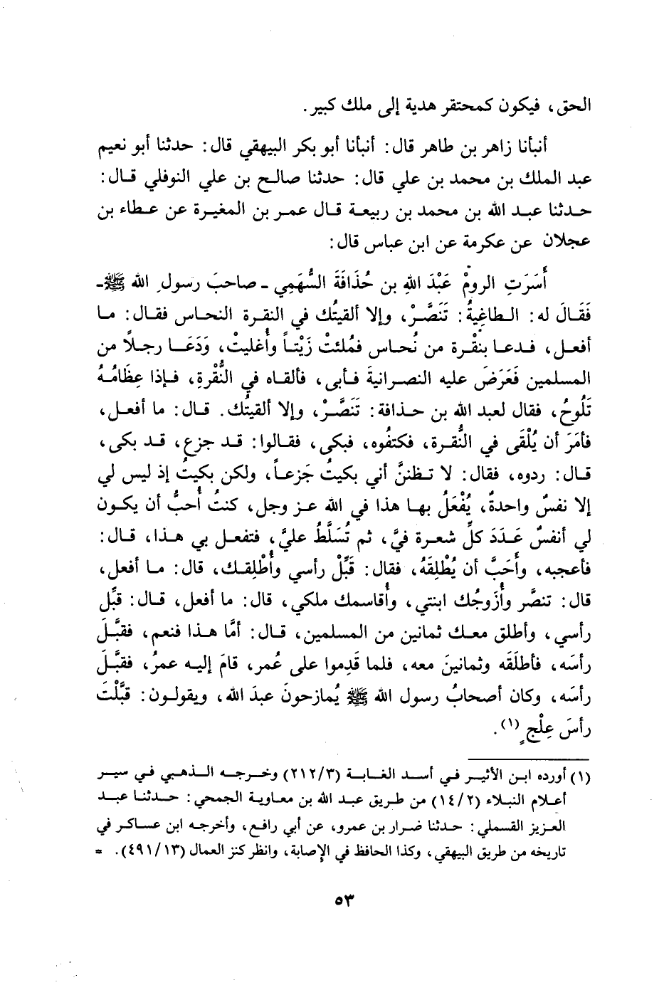 أسرت الرّوم عبد الله بْنَ حُذَافَةَ السَّهْمِيَّ صَاحِبَ رَسُولِ اللَّهِ صَلَّى اللَّهُ عَلَيْهِ وَسَلَّمَ فَقَالَ لَهُ الطَّاغِيَةُ تَنَصَّرْ وَإِلا أَلْقَيْتُكَ فِي النُّقْرَةِ النُّحَاسِ فَقَالَ مَا أَفْعَلُ فَدَعَا بِنُقْرَةٍ مِنْ نُحَاسٍ فَمُلِئَتْ زَيْتًا وَأُغْلِيَتْ وَدَعَا رَجُلا مِنَ الْمُسْلِمِينَ فَعَرَضَ عَلَيْهِ النَّصْرَانِيَّةَ فَأَبَى فَأَلْقَاهُ فِي النُّقْرَةِ فَإِذا عِظَامه تلوح فَقَالَ لعبد الله ابْن حُذَافَةَ تَنَصَّرْ وَإِلا أَلْقَيْتُكَ قَالَ مَا أَفْعَلُ فَأَمَرَ أَنْ يُلْقَى فِي النُّقْرَةِ فَكَتَّفُوهُ فَبَكَى فَقَالُوا قَدْ جَزِعٍَ قَدْ بَكَى قَالَ رُدُّوهُ فَقَالَ لَا تَظُنَّنَّ أَنِّي بَكَيْتُ جَزِعًا وَلَكِنْ بَكَيْتُ إِذْ لَيْسَ لِي إِلا نَفْسٌ وَاحِدَةٌ يُفْعَلُ بِهَا هَذَا فِي اللَّهِ عَزَّ وَجَلَّ كُنْتُ أُحِبُّ أَنْ يَكُونَ لِي أَنْفُسٌ عَدَدَ كُلِّ شَعْرَةٍ فِيَّ ثُمَّ تُسَلَّطُ عَلَيَّ فَتَفْعَلَ بِي هَذَا قَالَ فَأَعْجَبَهُ وَأَحَبَّ أَنْ يُطْلِقَهُ فَقَالَ قَبِّلْ رَأْسِي وَأُطْلِقُكَ قَالَ مَا أَفْعَلُ قَالَ تَنَصَّرْ وَأُزَوِّجُكَ ابْنَتِي وَأُقَاسِمُكَ مُلْكِي قَالَ مَا أَفْعَلُ قَالَ قَبِّلْ رَأْسِي وَأُطْلِقُ مَعَكَ ثَمَانِينَ مِنَ الْمُسْلِمِينَ قَالَ أَمَّا هَذَا فَنَعَمْ فَقَبَّلَ رَأْسَهُ فَأَطْلَقَهُ وَثَمَانِينَ مَعَهُ فَلَمَّا قَدِمُوا عَلَى عُمَرَ قَامَ إِلَيْهِ عُمَرُ فَقَبَّلَ رَأْسَهُ وَكَانَ أَصْحَاب رَسُولَ اللَّهِ صَلَّى اللَّهُ عَلَيْهِ وَسلم يمازحون عبد الله وَيَقُولُونَ قَبَّلْتَ رَأْسَ عِلْجٍ
