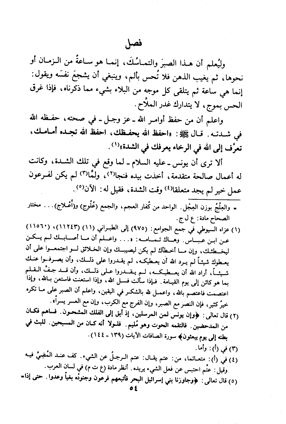 وَلْيُعْلَمَ أَنَّ هَذَا الصَّبْرَ وَالتَّمَاسُكَ إِنَّمَا هُوَ سَاعَةٌ مِنَ الزَّمَانِ أَوْ نَحْوُهَا ثُمَّ يَغِيبُ الذِّهْنُ فَلا تَحُسُّ بِأَلَمٍ وَيَنْبَغِي أَنْ يُشَجِّعَ نَفْسَهُ وَيَقُولُ إِنَّمَا هِيَ سَاعَةٌ ثُمَّ يَتَلَقَّى كُلُّ مُوَجَّهٍ مِنَ الْبَلاءِ بِشَيْءٍ مِمَّا ذَكَرْنَاهُ فَإِذَا غَرَقَ الْحِسُّ بِمَوْجٍ لَا يُتَدَارَكُ غَدْرُ الْمَلاحِ