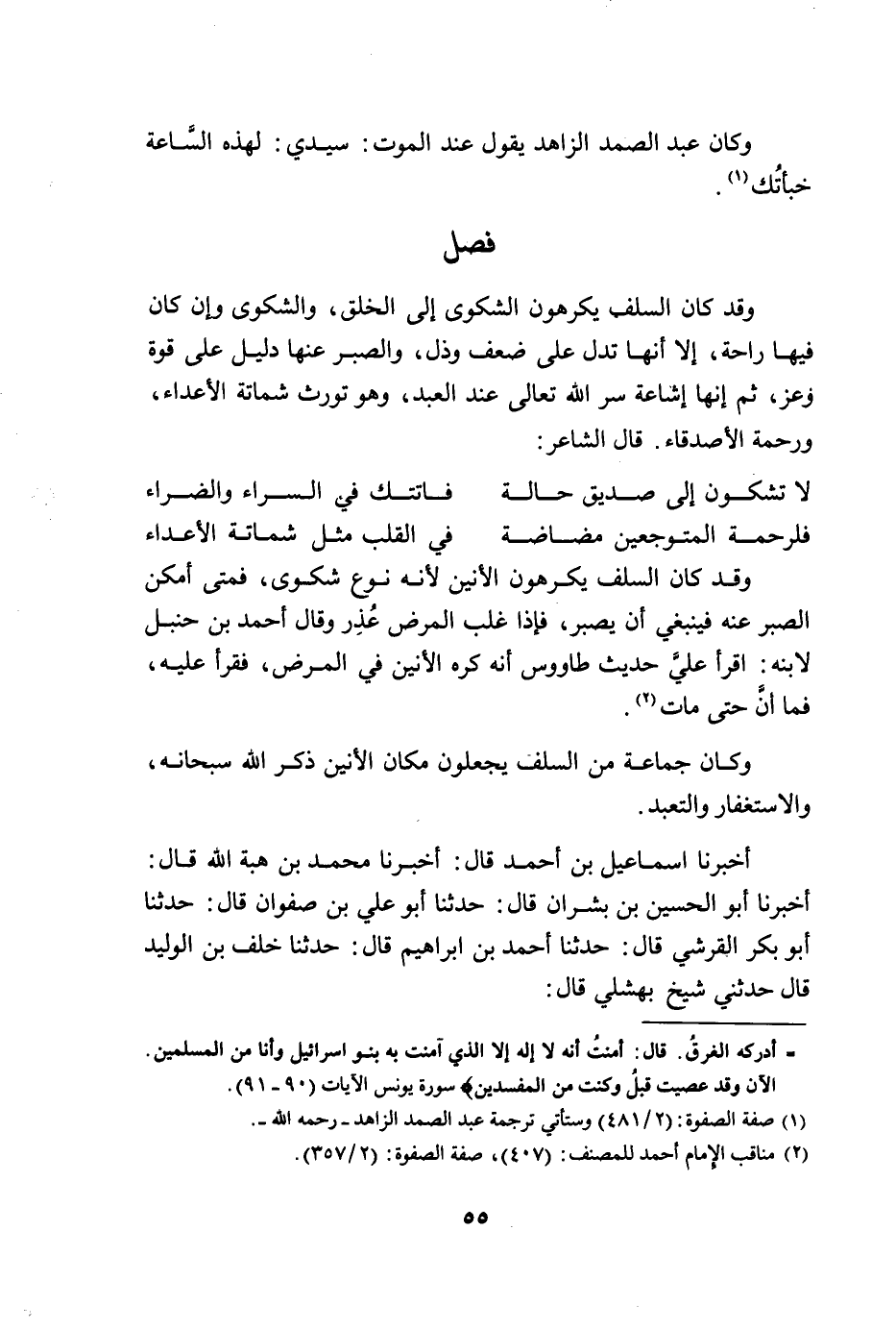 وَقَدْ كَانَ السَّلَفُ يَكْرَهُونَ الشَّكْوَى إِلَى الْخَلْقِ وَالشَّكْوَى وَإِنْ كَانَ فِيهَا رَاحَةٌ إِلا أَنَّهَا تَدُلُّ عَلَى ضَعْفٍ وَذُلٍّ وَالصَّبْرُ عَنْهَا دَلِيلٌ عَلَى قُوَّةٍ وَعِزٍّ ثُمَّ إِنَّهَا إِشَاعَةُ سِرِّ اللَّهِ تَعَالَى عِنْدَ العَبْد وَهُوَ تُورِثُ شَمَاتَةَ الأَعْدَاءِ وَرَحْمَةَ الأَصْدِقَاءِ قَالَ الشَّاعِرُ ... لَا تَشْكُوَنَّ إِلَى صَدِيقٍ حَالَةً ... فَاتَتْكَ فِي السَّرَّاءِ وَالضَّرَّاءِ