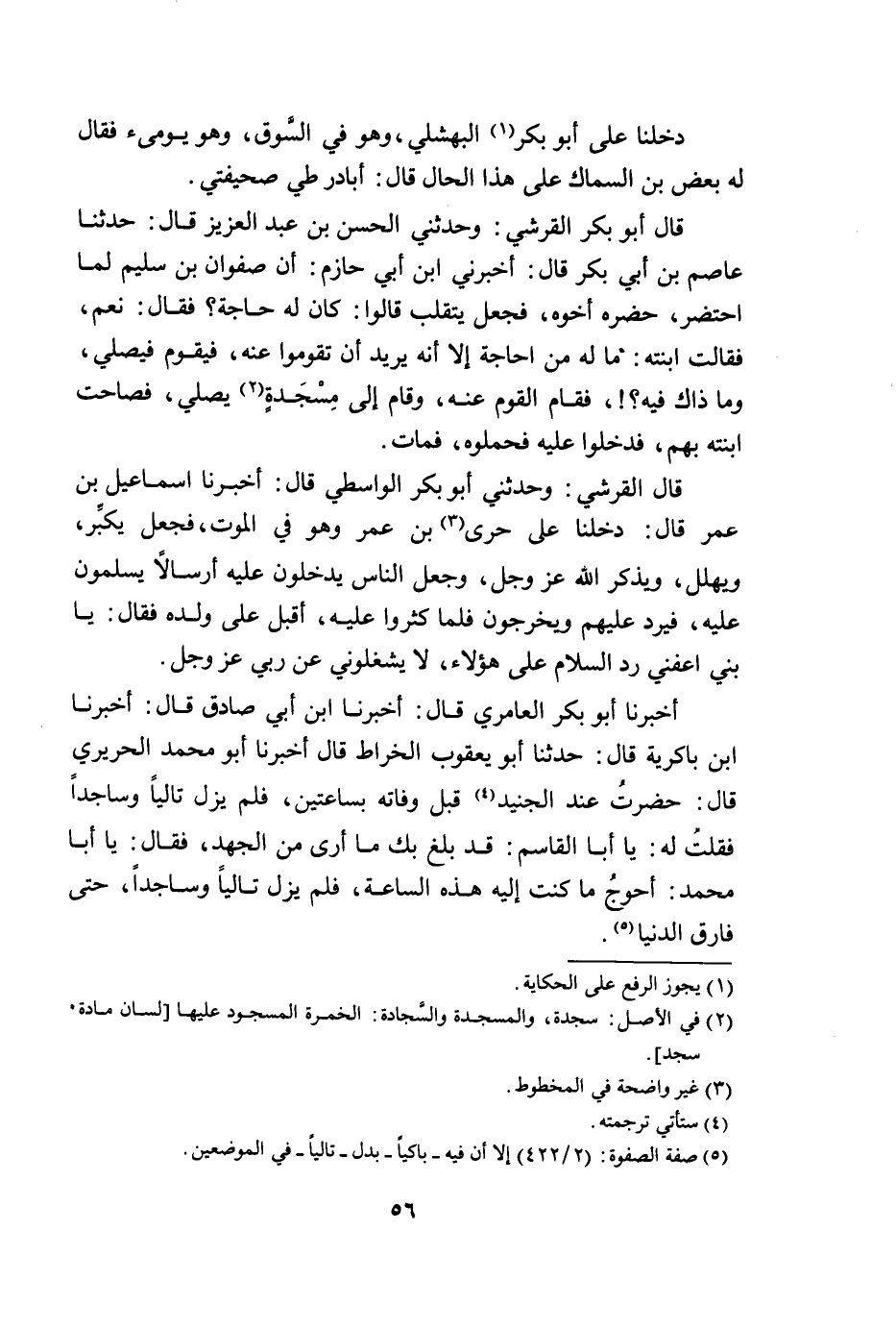 أَخْبَرَنَا أَبُو بَكْرٍ الْعَامِرِيُّ قَالَ أَخْبَرَنَا ابْنُ أَبِي صَادِقٍ قَالَ أَخْبَرَنَا ابْنُ بَاكِرِيَّةَ قَالَ حَدَّثَنَا أَبُو يَعْقُوبَ الْخَرَّاطُ قَالَ أَخْبَرَنَا أَبُو مُحَمَّدٍ الْحَرِيرِيُّ قَالَ حَضَرْتُ عِنْدَ الْجُنَيْدِ قَبْلَ وَفَاتِهِ بِسَاعَتَيْنِ فَلَمْ يَزَلْ تَالِيًا وَسَاجِدًا فَقُلْتُ لَهُ يَا أَبَا الْقَاسِمِ قَدْ بَلَغَ بِكَ مَا أَرَى مِنَ الْجَهْدِ فَقَالَ يَا أَبَا مُحَمَّدٍ أَحْوَجُ مَا كُنْتُ إِلَيْهِ هَذِهِ السَّاعَةَ فَلَمْ يَزَلْ تَالِيًا وَسَاجِدًا حَتَّى فَارَقَ الدُّنْيَا