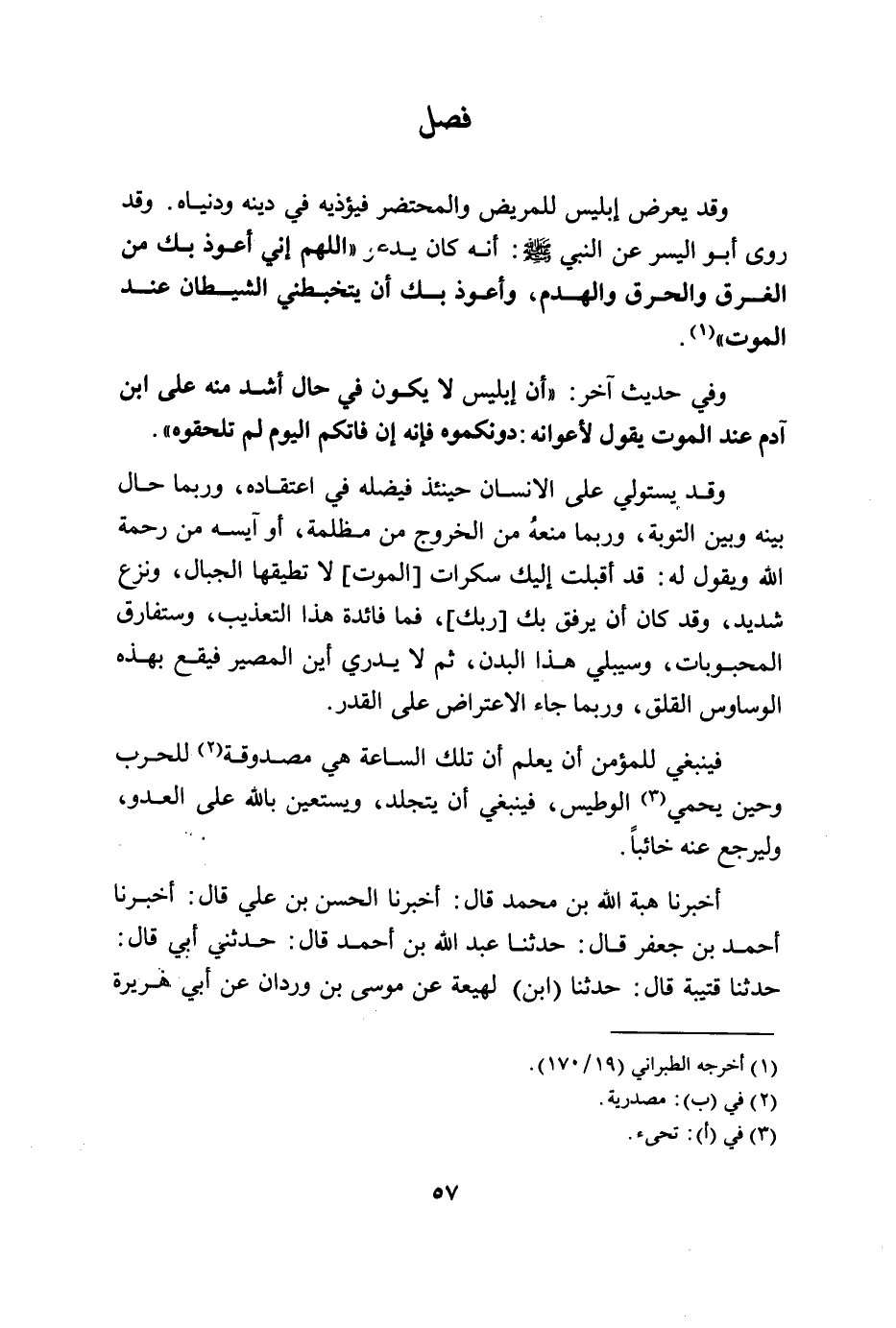 وَقَدْ يَعْرِضُ إِبْلِيسُ لِلْمَرِيضِ وَالْمُحْتَضَرِ فَيُؤْذِيهِ فِي دِينِهِ وَدُنْيَاهُ وَقَدْ رَوَى أَبُو الْيُسْرِ عَنِ النَّبِيُّ صَلَّى اللَّهُ عَلَيْهِ وَسَلَّمَ أَنَّهُ كَانَ يَدْعُو اللَّهُمَّ إِنِّي أَعُوذُ بِكَ مِنَ الْغَرَقِ وَالْحَرْقِ وَالْهَدْمِ وَأَعُوذُ بِكَ أَنْ يَتَخَبَّطَنِيَ الشَّيْطَانُ عِنْدَ الْمَوْتِ