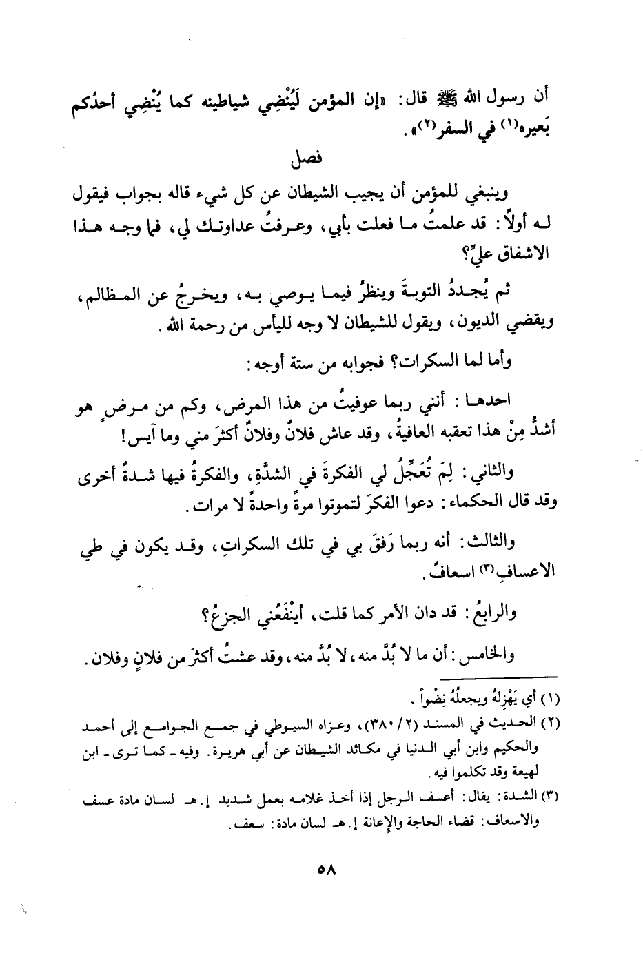 أَنّ رَسُولَ اللَّهِ صَلَّى اللَّهُ عَلَيْهِ وَسَلَّمَ قَالَ إِنَّ الْمُؤْمِنَ لَيُنْضِي شَيَاطِينَهُ كَمَا يُنْضِي أَحَدُكُمْ بَعِيرَهُ فِي السَّفَرِ