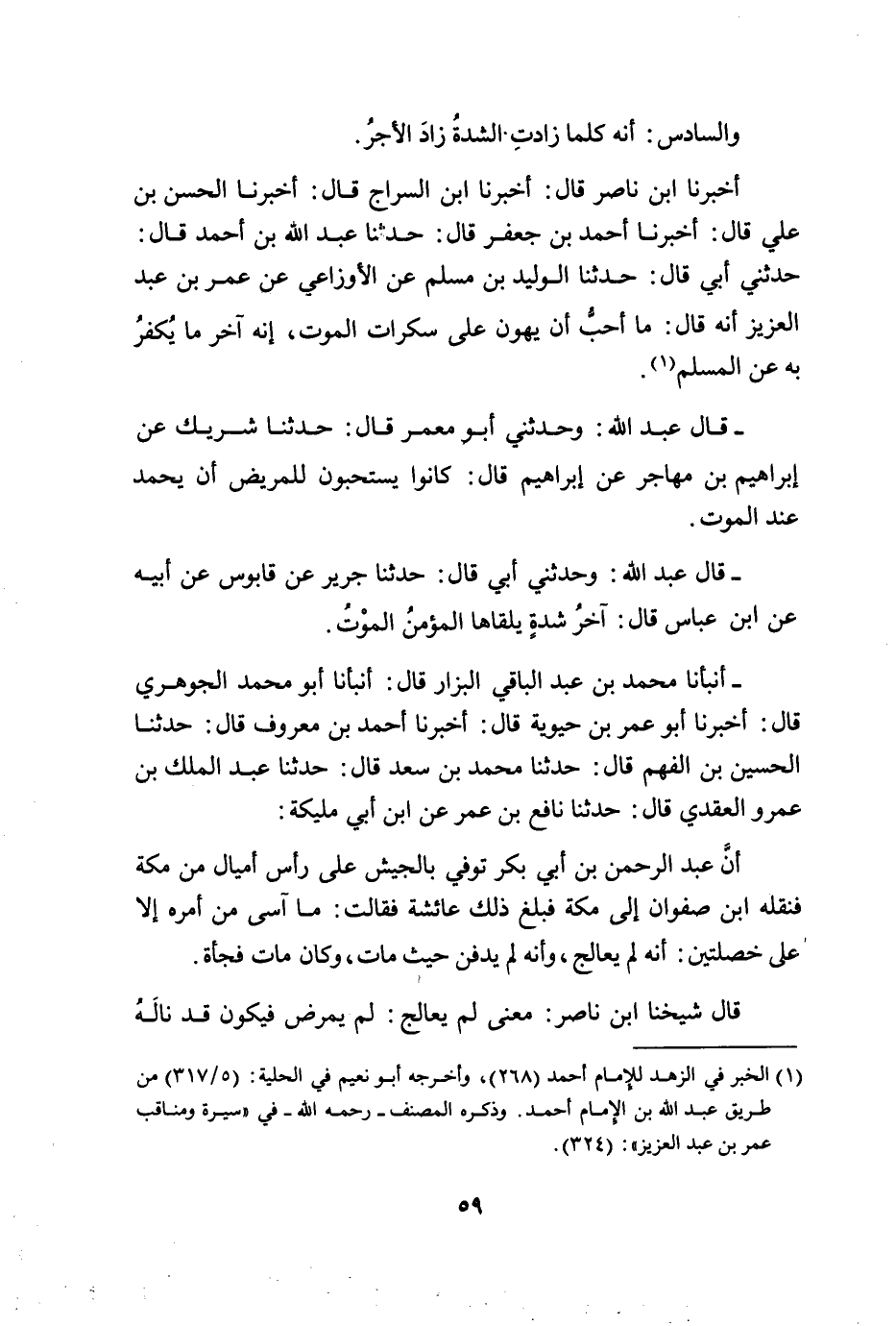 أَخْبَرَنَا ابْنُ نَاصِرٍ قَالَ أَخْبَرَنَا ابْنُ السَّرَّاجِ قَالَ أَخْبَرَنَا الْحَسَنُ بْنُ عَلِيٍّ قَالَ أَخْبَرَنَا أَحْمَدُ بْنُ جَعْفَرٍ قَالَ حَدثنَا عبد الله بْنُ أَحْمَدَ قَالَ حَدَّثَنِي أَبِي قَالَ حَدَّثَنَا الْوَلِيدُ بْنُ مُسْلِمٍ عَنِ الأَوْزَاعِيِّ عَنْ عُمَرَ بْنِ عبد العزيز أَنَّهُ قَالَ مَا أُحِبُّ أَنْ يَهُونَ عَلَيَّ سَكَرَاتُ الْمَوْتِ إِنَّهُ آخِرُ مَا يُكَفَّرُ بِهِ عَنِ الْمُسلم