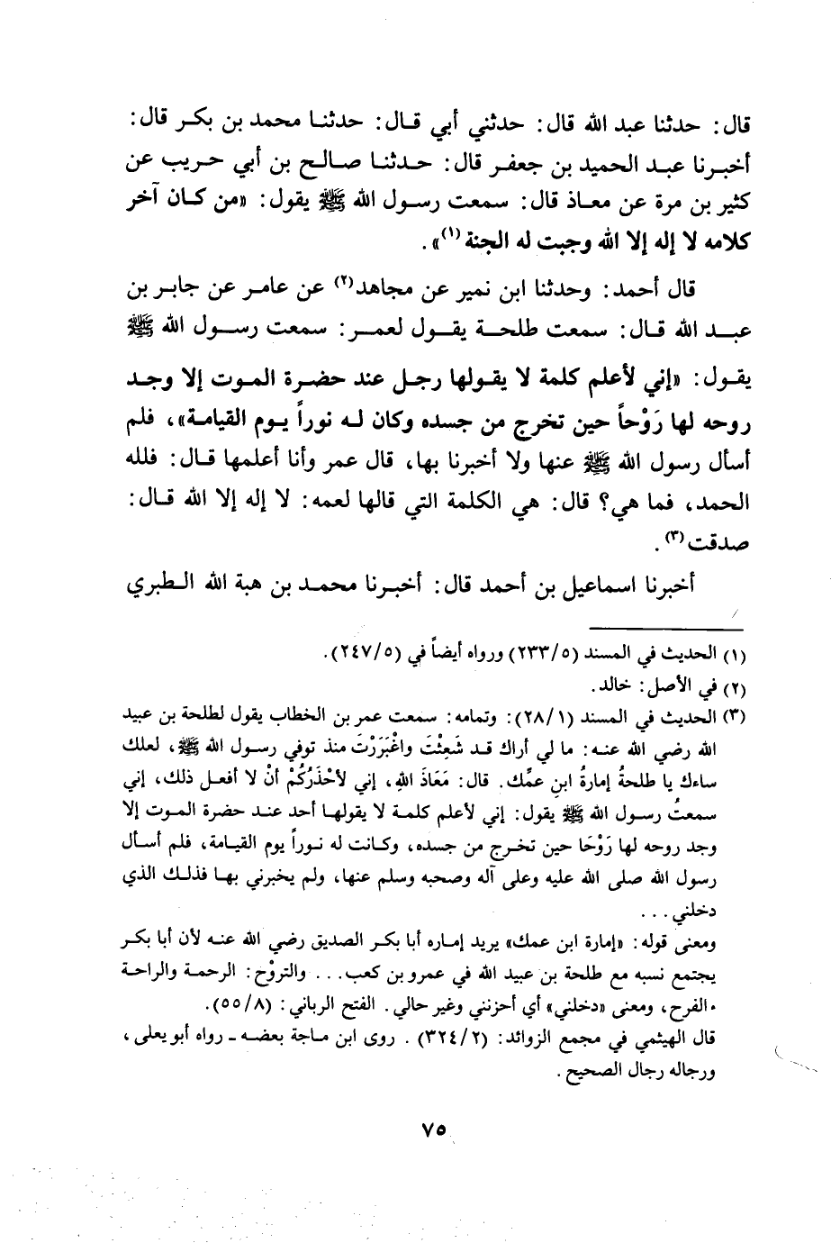 قَالَ أَحْمَدُ وَحَدَّثَنَا ابْنُ نُمَيْرٍ عَنْ مُجَاهِدٍ عَنْ عَامِرٍ عَن جَابر بن عبد الله قَالَ سَمِعْتُ طَلْحَةَ يَقُولُ لِعُمَرَ سَمِعْتُ رَسُولَ اللَّهِ صَلَّى اللَّهُ عَلَيْهِ وَسَلَّمَ يَقُولُ إِنِّي لأَعْلَمُ كَلِمَةً لَا يَقُولُهَا رَجُلٌ عِنْدَ حَضْرَةِ الْمَوْتِ إِلا وَجَدَ رُوحَهُ لَهَا رَوْحًا حِينَ تَخْرُجُ مِنْ جَسَدِهِ وَكَانَ لَهُ نُورًا يَوْمَ الْقِيَامَةِ فَلَمْ أَسْأَلْ رَسُولَ اللَّهِ صَلَّى اللَّهُ عَلَيْهِ وَسَلَّمَ عَنْهَا وَلا أَخْبَرَنَا بِهَا قَالَ عُمَرُ وَأَنَا أَعْلَمُهَا قَالَ فَلِلَّهِ الْحَمْدُ فَمَا هِيَ قَالَ هِيَ الْكَلِمَةُ الَّتِي قَالَهَا لِعَمِّهِ لَا لَهُ إِلا اللَّهُ قَالَ صَدَقْتَ