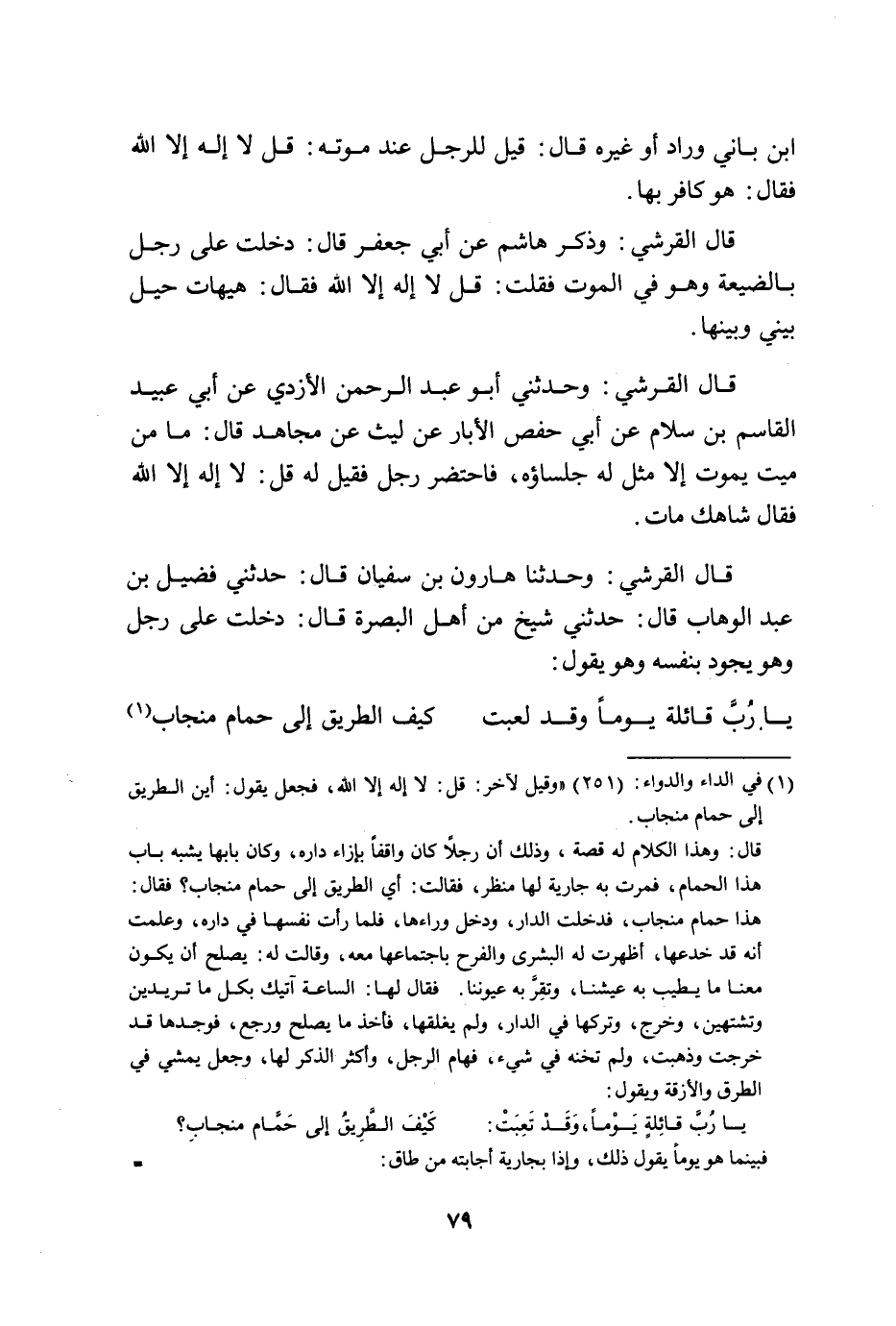 قَالَ الْقُرَشِيُّ وَحَدَّثَنَا هَارُونُ بْنُ سُفْيَانَ قَالَ حَدَّثَنِي فُضَيْلُ بن عبد الوهاب قَالَ حَدَّثَنِي شَيْخٌ مِنْ أَهْلِ الْبَصْرَةِ قَالَ دَخَلْتُ عَلَى رَجُلٍ وَهُوَ يَجُودُ بِنَفْسِهِ وَهُوَ يَقُولُ ... يَا رُبَّ قَائِلَةٍ يَوْمًا وَقَدْ لَعِبَتْ ... كَيْفَ الطَّرِيقُ إِلَى حَمَّامِ مِنْجَابِ ...