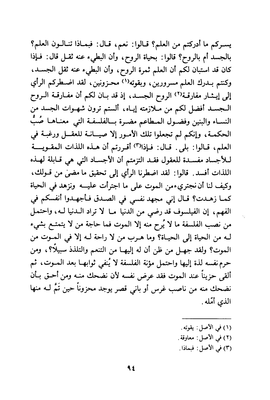 يَسُرُّكُمْ مَا أَدْرَكْتُمْ مِنَ الْعِلْمِ قَالُوا نَعَمْ قَالَ فَبِمَاذَا تَنَالُونَ الْعِلْمَ بِالْجَسَدِ أَمْ بِالرُّوحِ قَالُوا بِحَيَاةِ الرُّوحِ وَأَنَّ الْبَطِيء عَنْهُ ثِقَلٌ قَالَ فَإِذَا كَانَ قَدِ استبان لكم أَن الْعلم ثَمَرَةُ الرُّوحِ وَأَنَّ الْبَطِيءَ عَنْهُ ثِقَلُ الْجَسَدِ وَكُنْتُمْ بِدَرْكِ الْعِلْمِ مَسْرُورِينَ وَبِقُوَّتِهِ مَحْزُونِينَ لَقَدِ اضْطَرَّكُمُ الرَّأْيُ إِلَى إِيثَارِ مُفَارَقَةِ الرُّوحِ الْجَسَدِ إِذْ قَدْ بَانَ لَكُمْ أَنَّ مُفَارَقَةَ الرُّوحِ الْجَسَدِ أَفْضَلُ لَكُمْ مِنْ مُلازَمَتِهِ إِيَّاهُ أَلَسْتُمْ تَرَوْنَ شَهَوَاتِ الْجَسَدِ مِنَ النِّسَاءِ وَالْبَنِينَ وَفُضُولَ الْمَطَاعِمِ مَضَرَّةً بِالْفَلْسَفَةِ الَّتِي مَعْنَاهَا صَبُّ الْحِكْمَةِ وَإِنَّكُمْ لَمْ تَجْعَلُوا تِلْكَ الأُمُورَ إِلا صِيَانَةً لِلْعَقْلِ وَرَغْبَةً فِي الْعِلْمِ قَالُوا بلَى قَالَ فَإذْ أَقْرَرْتُمْ أَنَّ هَذِهِ اللَّذَّاتِ الْمُقَوِّيَةَ لِلأَجْسَادِ مُفْسِدَةٌ لِلْعُقُولِ فَقَدِ الْتَزَمْتُمْ أَنَّ الأَجْسَادَ الَّتِي هِيَ قَابِلَةٌ لِهَذِهِ اللَّذَّاتِ أَفْسَدُ قَالُوا لَقَدِ اضْطَرَّنَا الرَّأْيُ إِلَى تَحْقِيقِ مَا مَضَى مِنْ قَوْلِكَ وَكَيْفَ لَنَا أَن نجترئ مِنَ الْمَوْتِ عَلَى مَا اجْتَرَأْتَ عَلَيِهِ وَنَزْهَدُ فِي الْحَيَاةِ كَمَا زَهِدْتَ قَالَ إِنِّي مُجْهِدٌ نَفْسِي فِي الصِّدْقِ فَأَجْهِدُوا أَنْفُسَكُمْ فِي الْفَهْمِ إِنَّ الْفَيْلَسُوفَ قَدْ رَضِيَ من الدُّنْيَا مَالا تُرَادُ الدُّنْيَا لَهُ وَاحْتَمَلَ مِنْ نَصَبِ الْفَلْسَفَةِ مَا لَا يُرِحْ مِنْهُ إِلا الْمَوْتُ فَمَا حَاجَةُ مَنْ لَا يَتَمَتَّعُ بِشَيْءٍ لَهُ مِنَ الْحَيَاةِ إِلَى الْحَيَاةِ وَمَا هَرَبُ مَنْ لَا رَاحَةَ لَهُ إِلا فِي الْمَوْتِ مِنَ الْمَوْتِ وَلَقَدْ جَهِلَ مَنْ ظَنَّ أَنَّ لَهُ إِلَيْهَا مِنَ التَّنَعُّمِ وَالتَّلَذُّذِ سَبِيلا وَمَنْ حَرَمَ نَفْسَهَ لَذَّةً إِلَيْهَا وَاحْتَمَلَ مُؤْنَةَ الْفَلْسَفَةِ لَا يَنْفِي ثَوَابَهَا بَعْدَ الْمَوْتِ ثُمَّ أُلْقَى حَزِينًا عِنْدَ الْمَوْتِ فَقَدْ عَرَّضَ نَفْسَهُ لأَنْ نَضْحَكَ مِنْهُ وَمَنْ أَحَقُّ بِأَنْ نَضْحَكَ مِنْهُ مِنْ نَاصِبٍ غَرَسَ أَوْ بَانِي قَصْرَ يُوجَدُ مَحْزُونًا حِينَ تَمَّ لَهُ مِنْهَا الَّذِي أَمِلَهُ