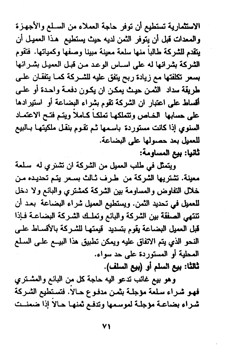 الاستثمارية تستطيع أن توفر حاجة العملاء من السلع والأجهزة والمعدات قبل أن يتوفر الثمن لديه حيث يستطيع هذا العميل أن يتقدم للشركة طالباً منها سلعة معينة مبينا وصفها وكمياتها. فتقوم الشركة بشرائها له على اساس الوعد من قبل العميل بشرائها بسعر تكلفتها مع زيادة ربح يتفق عليه للشركة كما يتفقان على طريقة سداد الثمن حيث يمكن ان يكون دفعة واحدة أو على أقساط على اعتبار ان الشركة تقوم بشراء البضاعة أو استيرادها على حسابها الخاص وتتملكها تملكاً كاملاً ويتم فتح الاعتماد السنوي إذا كانت مستوردة باسمها ثم تقوم بنقل ملكيتها بالبيع للعميل بعد حصولها على البضاعة.