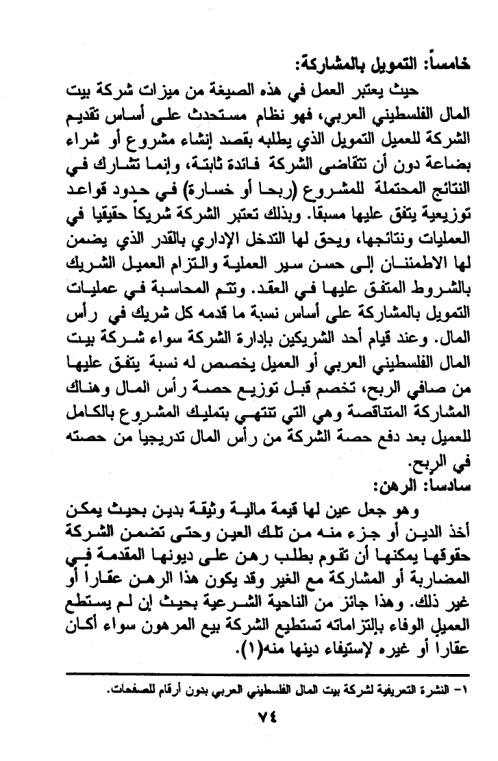 حيث يعتبر العمل في هذه الصيغة من ميزات شركة بيت المال الفلسطيني العربي، فهو نظام مستحدث على أساس تقديم الشركة للعميل التمويل الذي يطلبه بقصد إنشاء مشروع أو شراء بضاعة دون أن تتقاضى الشركة فائدة ثابتة، وإنما تشارك في النتائج المحتملة للمشروع (ربحا أو خسارة) في حدود قواعد توزيعية يتفق عليها مسبقاً. وبذلك تعتبر الشركة شريكاً حقيقيا في العمليات ونتائجها، ويحق لها التدخل الإداري بالقدر الذي يضمن لها الاطمئنان إلى حسن سير العملية والتزام العميل الشريك بالشروط المتفق عليها في العقد. وتتم المحاسبة في عمليات التمويل بالمشاركة على أساس نسبة ما قدمه كل شريك في رأس المال. وعند قيام أحد الشريكين بإدارة الشركة سواء شركة بيت المال الفلسطيني العربي أو العميل يخصص له نسبة يتفق عليها من صافي الربح، تخصم قبل توزيع حصة رأس المال وهناك المشاركة المتناقصة وهي التي تنتهي بتمليك المشروع بالكامل للعميل بعد دفع حصة الشركة من رأس المال تدريجياً من حصته في الربح.