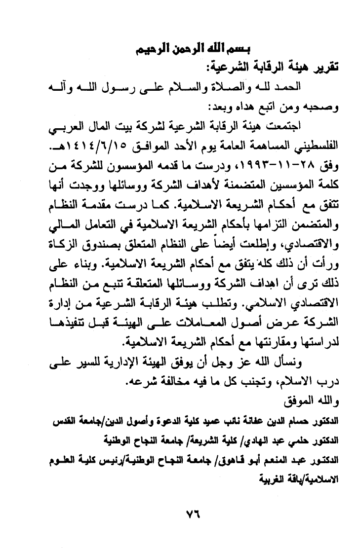 اجتمعت هيئة الرقابة الشرعية لشركة بيت المال العربي الفلسطيني المساهمة العامة يوم الأحد الموافق 15/ 6/1414هـ. وفق 28 - 11 - 1993، ودرست ما قدمه المؤسسون للشركة من كلمة المؤسسين المتضمنة لأهداف الشركة ووسائلها ووجدت أنها تتفق مع أحكام الشريعة الإسلامية. كما درست مقدمة النظام والمتضمن التزامها بأحكام الشريعة الإسلامية في التعامل المالي والاقتصادي، وإطلعت أيضاً على النظام المتعلق بصندوق الزكاة ورأت أن ذلك كله يتفق مع أحكام الشريعة الإسلامية. وبناء على ذلك ترى أن اهداف الشركة ووسائلها المتعلقة تنبع من النظام الاقتصادي الإسلامي. وتطلب هيئة الرقابة الشرعية من إدارة الشركة عرض أصول المعاملات على الهيئة قبل تنفيذها لدراستها ومقارنتها مع أحكام الشريعة الإسلامية.