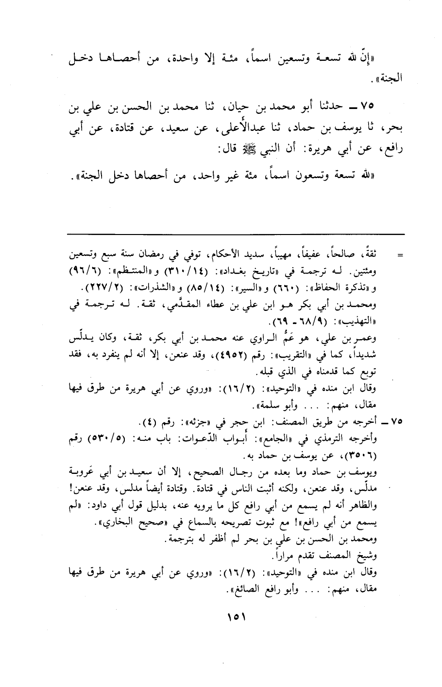 75 - حَدَّثَنَا أَبُو مُحَمَّدِ بْنُ حَيَّانَ، ثَنَا مُحَمَّدُ بْنُ الْحَسَنِ بْنِ عَلِيِّ بْنِ بَحْرٍ، ثَنَا يُوسُفُ بْنُ حَمَّادٍ، ثَنَا عَبْدُ الْأَعْلَى، عَنْ سَعِيدٍ، عَنْ قَتَادَةَ، عَنْ أَبِي رَافِعٍ، عَنْ أَبِي هُرَيْرَةَ، أَنَّ النَّبِيَّ صَلَّى اللهُ عَلَيْهِ وَسَلَّمَ قَالَ: «§لِلَّهِ تِسْعَةٌ وَتِسْعُونَ اسْمًا، مِائَةٌ غَيْرُ وَاحِدٍ، مَنْ أَحْصَاهَا دَخَلَ الْجَنَّةَ»
