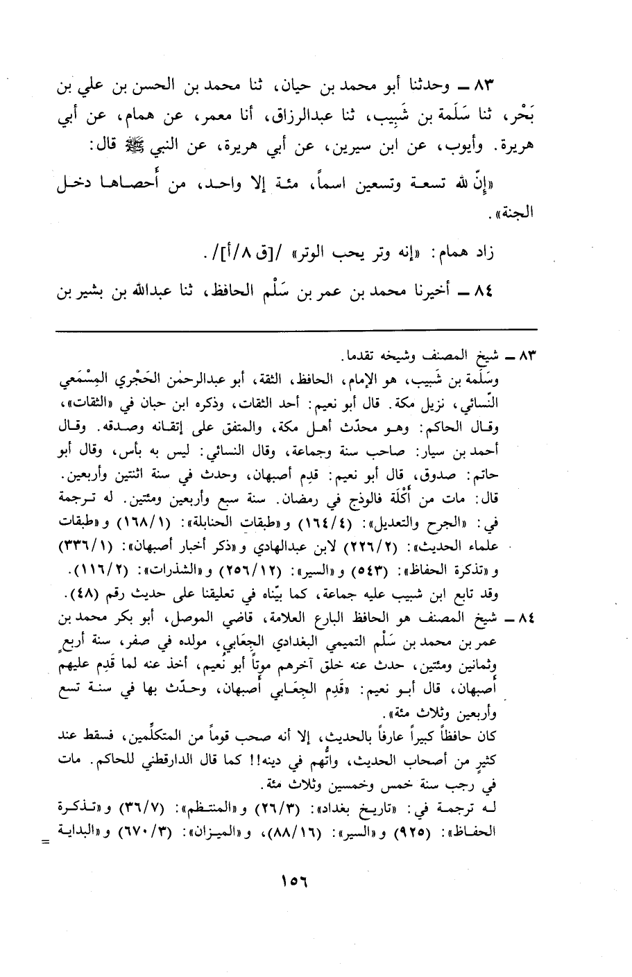 84 - أَخْبَرَنَا مُحَمَّدُ بْنُ عُمَرَ بْنِ سَلْمٍ الْحَافِظُ، ثَنَا عَبْدُ اللَّهِ بْنُ بَشِيرِ بْنِ صَالِحٍ، ثَنَا إِبْرَاهِيمُ بْنُ الْحَسَنِ الْمِقْسَمِيُّ، ثَنَا عَبْدُ الْوَاحِدِ بْنُ سُلَيْمَانَ، عَنْ سَعِيدٍ الْجُرَيْرِيِّ، عَنْ عَبْدِ اللَّهِ بْنِ شَقِيقٍ، عَنْ أَبِي هُرَيْرَةَ، عَنِ النَّبِيِّ صَلَّى اللهُ عَلَيْهِ وَسَلَّمَ -[157]- قَالَ: «§إِنَّ لِلَّهِ تِسْعَةٌ وَتِسْعِينَ اسْمًا، مَنْ أَحْصَاهَا دَخَلَ الْجَنَّةَ»
