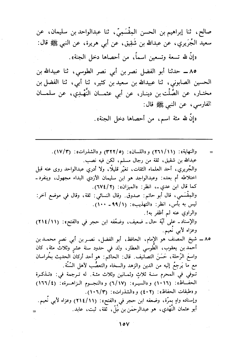 85 - حَدَّثَنَا أَبُو الْفَضْلِ نَصْرُ بْنُ أَبِي نَصْرٍ الطُّوسِيُّ، ثَنَا عُبَيْدُ اللَّهِ بْنُ الْحُسَيْنِ الصَّابُونِيُّ، ثَنَا عُبَيْدُ اللَّهِ بْنُ سَعِيدِ بْنِ كَثِيرٍ، ثَنَا أَبِي، ثَنَا الْفَضْلُ بْنُ مُخْتَارٍ، عَنِ الصَّلْتِ بْنِ دِينَارٍ، عَنْ أَبِي عُثْمَانَ النَّهْدِيِّ، عَنْ سَلْمَانَ الْفَارِسِيِّ، عَنِ النَّبِيِّ صَلَّى اللهُ عَلَيْهِ وَسَلَّمَ قَالَ: «§إِنَّ لِلَّهِ مِئَةُ اسْمٍ، مَنْ أَحْصَاهَا دَخَلَ الْجَنَّةَ»