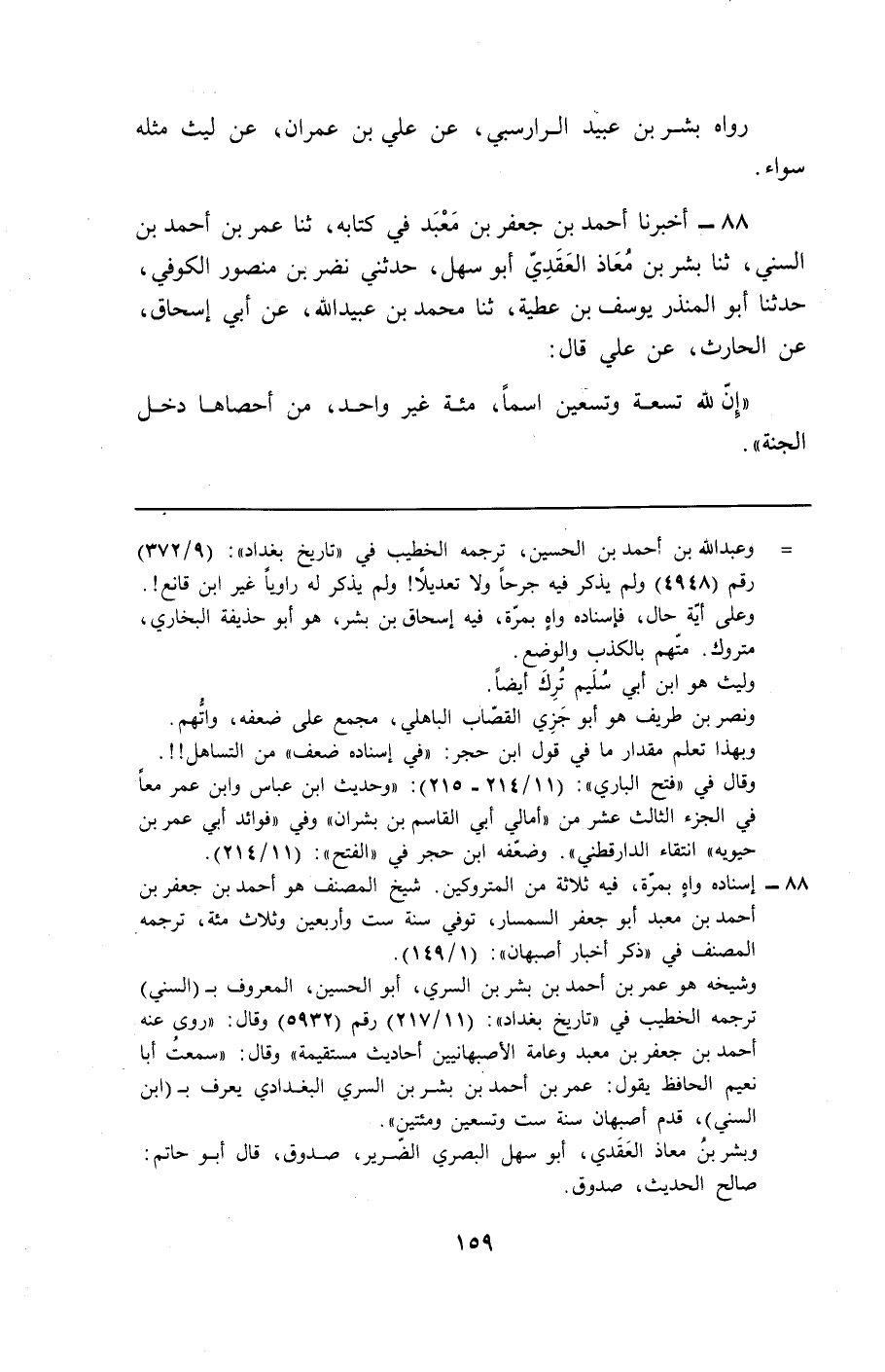 88 - أَخْبَرَنَا أَحْمَدُ بْنُ جَعْفَرِ بْنِ مَعْبَدٍ فِي كِتَابِهِ، ثَنَا عُمَرُ بْنُ أَحْمَدَ بْنِ السُّنِّيِّ، ثَنَا بِشْرُ بْنُ مُعَاذٍ الْعَقَدِيُّ أَبُو سَهْلٍ، حَدَّثَنِي نَضْرُ بْنُ مَنْصُورٍ الْكُوفِيُّ، حَدَّثَنَا أَبُو الْمُنْذِرِ يُوسُفُ بْنُ عَطِيَّةَ، ثَنَا مُحَمَّدُ بْنُ عُبَيْدِ اللَّهِ، عَنْ أَبِي إِسْحَاقَ، عَنِ الْحَارِثِ، عَنْ عَلِيٍّ، قَالَ: «إِنَّ §لِلَّهِ تِسْعَةً وَتِسْعِينَ اسْمًا، مِائَةً غَيْرَ وَاحِدٍ، مَنْ أَحْصَاهَا دَخَلَ الْجَنَّةَ»