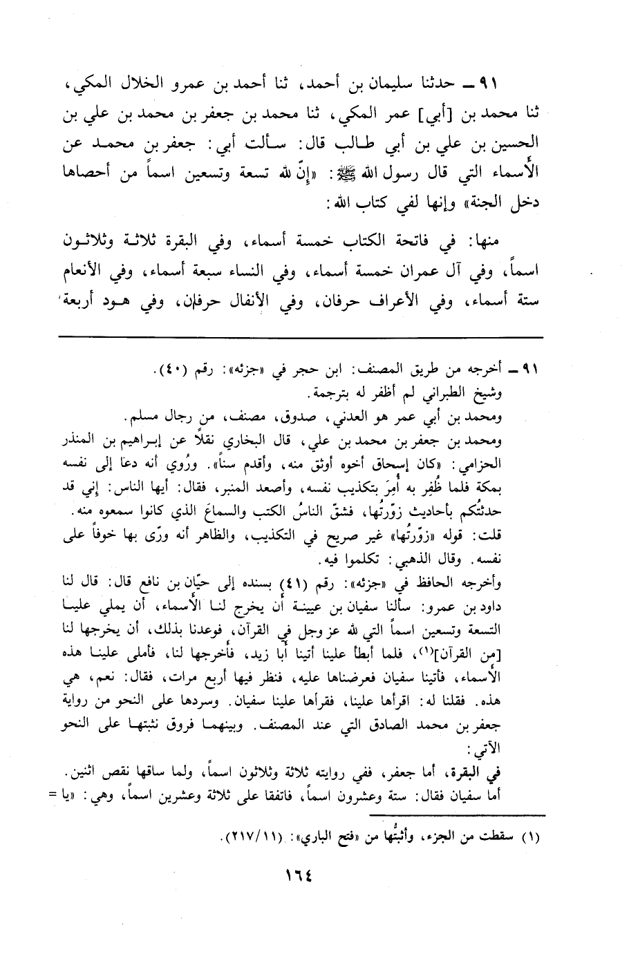 91 - حَدَّثَنَا سُلَيْمَانُ بْنُ أَحْمَدَ، ثَنَا أَحْمَدُ بْنُ عَمْرٍو الْخَلَّالُ الْمَكِّيُّ، ثَنَا مُحَمَّدُ بْنُ أَبِي عُمَرَ الْمَكِّيُّ، ثَنَا مُحَمَّدُ بْنُ جَعْفَرِ بْنِ مُحَمَّدِ بْنِ عَلِيِّ بْنِ الْحُسَيْنِ بْنِ عَلِيِّ بْنِ أَبِي طَالِبٍ، قَالَ: سَأَلْتُ أَبِي جَعْفَرَ بْنَ مُحَمَّدٍ عَنِ الْأَسْمَاءِ الَّتِي قَالَ رَسُولُ اللَّهِ صَلَّى اللهُ عَلَيْهِ وَسَلَّمَ: «§إِنَّ لِلَّهِ تِسْعَةً وَتِسْعِينَ اسْمًا، مَنْ أَحْصَاهَا دَخَلَ الْجَنَّةَ» وَإِنَّهَا لَفِي كِتَابِ اللَّهِ، مِنْهَا فِي فَاتِحَةِ الْكِتَابِ خَمْسَةُ أَسْمَاءٍ، وَفِي الْبَقَرَةِ ثَلَاثَةٌ وَثَلَاثُونَ اسْمًا، وَفِي آلِ عِمْرَانَ خَمْسَةُ أَسْمَاءٍ، وَفِي النِّسَاءِ سَبْعَةُ أَسْمَاءٍ، وَفِي الْأَنْعَامِ سِتَّةُ أَسْمَاءٍ، وَفِي الْأَعْرَافِ حَرْفَانِ، وَفِي الْأَنْفَالِ حَرْفَانِ، وَفِي هُودٍ أَرْبَعَةُ -[165]- أَسْمَاءٍ، وَفِي الرَّعْدِ حَرْفَانِ، وَفِي إِبْرَاهِيمَ اسْمٌ وَاحِدٌ، وَفِي الْحِجْرِ اسْمٌ وَاحِدٌ، وَفِي مَرْيَمَ ثَلَاثَةُ أَسْمَاءٍ، وَفِي طه اسْمٌ وَاحِدٌ، وَفِي الْحَجِّ اسْمٌ وَاحِدٌ، وَفِي الْمُؤْمِنِينَ اسْمٌ وَاحِدٌ، وَفِي النُّورِ ثَلَاثَةُ أَسْمَاءٍ، وَفِي الْفُرْقَانِ اسْمٌ وَاحِدٌ، وَفِي سَبَأٍ اسْمٌ وَاحِدٌ، وَفِي الزُّمَرِ أَرْبَعَةُ أَسْمَاءٍ، وَفِي الْمُؤْمِنِ أَرْبَعَةُ أَسْمَاءٍ، وَفِي الذَّارِيَاتِ اسْمَانِ، وَفِي الطُّورِ اسْمٌ وَاحِدٌ، وَفِي اقْتَرَبَتِ السَّاعَةُ حَرْفَانِ، وَفِي الرَّحْمَنِ أَرْبَعَةُ أَسْمَاءٍ، وَفِي الْحَدِيدِ أَرْبَعَةُ أَسْمَاءٍ، وَفِي الْحَشْرِ إِحْدَى عَشْرَةَ، وَفِي الْبُرُوجِ حَرْفَانِ، وَفِي الْفَجْرِ وَاحِدٌ، وَفِي الْإِخْلَاصِ حَرْفَانِ -[166]-، فَإِذَا تَلَيْتَ هَذِهِ الْأَسْمَاءَ، فَإِنَّ فِيهَا أَسْمَاءَ اللَّهِ، إِذَا دُعِيَ بِهِ أَجَابَ، وَإِذَا سُئِلَ أَعْطَى، فَإِذَا هَمَمْتَ أَنْ تَدْعُوَ بِهَذِهِ الْأَسْمَاءَ فَلْيَكُنْ ذَلِكَ بَعْدَ صِيَامٍ وَاجِبٍ، أَوْ صَوْمِ الْخَمِيسِ، وَتَدْعُو فِي آخِرِ لَيْلَةِ الْجُمُعَةِ، وَقْتَ السَّحَرِ: اللَّهُ لَا إِلَهَ إِلَّا هُوَ، مَا يَدْعُو بِهَذِهِ الْأَسْمَاءَ عَبْدٌ مُؤْمِنٌ إِلَّا أَجَابَهُ اللَّهُ، وَلَوْ سَأَلَ يَمْشِي عَلَى الْمَاءِ لَأَجَابَهُ اللَّهُ، أَوْ عَلَى مَتْنِ الرِّيحِ -[167]-، فَأَمَّا الْخَمْسَةُ فِي فَاتِحَةِ الْكِتَابِ: يَا اللَّهُ، يَا رَبُّ، يَا رَحْمَنُ، يَا رَحِيمُ، يَا مَالِكُ، وَأَمَّا الثَّلَاثَةُ وَالثَّلَاثُونَ الَّتِي فِي الْبَقَرَةِ: يَا مُحِيطُ، يَا قَدِيرُ، يَا عَلِيمُ، يَا حَكِيمُ، يَا تَوَّابُ، يَا رَحِيمُ، يَا بَصِيرُ، يَا عَظِيمُ، يَا وَلِيُّ، يَا نَصِيرُ، يَا وَاسِعُ، يَا بَدِيعُ، يَا سَمِيعُ، يَا عَزِيزُ، يَا كَافِي، يَا رَءُوفُ، يَا شَاكِرُ، يَا وَاحِدُ، يَا قَوِيُّ، يَا شَدِيدُ، يَا قَرِيبُ، يَا مُجِيبُ، يَا سَرِيعُ، يَا حَلِيمُ، يَا خَبِيرُ، يَا قَابِضُ، يَا بَاسِطُ، يَا حَيُّ، يَا قَيُّومُ، يَا غَنِيُّ، يَا حَمِيدُ. وَأَمَّا الَّتِي فِي آلِ عِمْرَانَ: يَا وَهَّابُ، يَا قَائِمُ، يَا صَادِقُ، يَا مُنْعِمُ، يَا مُتَفَضِّلُ. وَأَمَّا الَّتِي فِي النِّسَاءِ: يَا رَقِيبُ، يَا حَسِيبُ، يَا شَهِيدُ، يَا مُقِيتُ، يَا عَلِيُّ، يَا كَبِيرُ، يَا وَكِيلُ -[168]-. وَأَمَّا الَّتِي فِي الْأَنْعَامِ: يَا غَفُورُ، يَا بُرْهَانُ، يَا فَاطِرُ، يَا قَاهِرُ، يَا مُمِيتُ. وَأَمَّا الَّتِي فِي الْأَعْرَافِ: يَا مُحْيِي، يَا مُمِيتُ -[169]-. وَأَمَّا الَّتِي فِي الْأَنْفَالِ: يَا نِعْمَ الْمَوْلَى، وَنِعْمَ النَّصِيرِ. وَأَمَّا الَّتِي فِي هُودٍ: يَا مُحِيطُ، يَا مَجِيدُ، يَا وَدُودُ، يَا فَعَّالٌ لِمَا تُرِيدُ. وَأَمَّا الَّتِي فِي الرَّعْدِ: يَا كَبِيرُ، يَا مُتَعَالِ. و