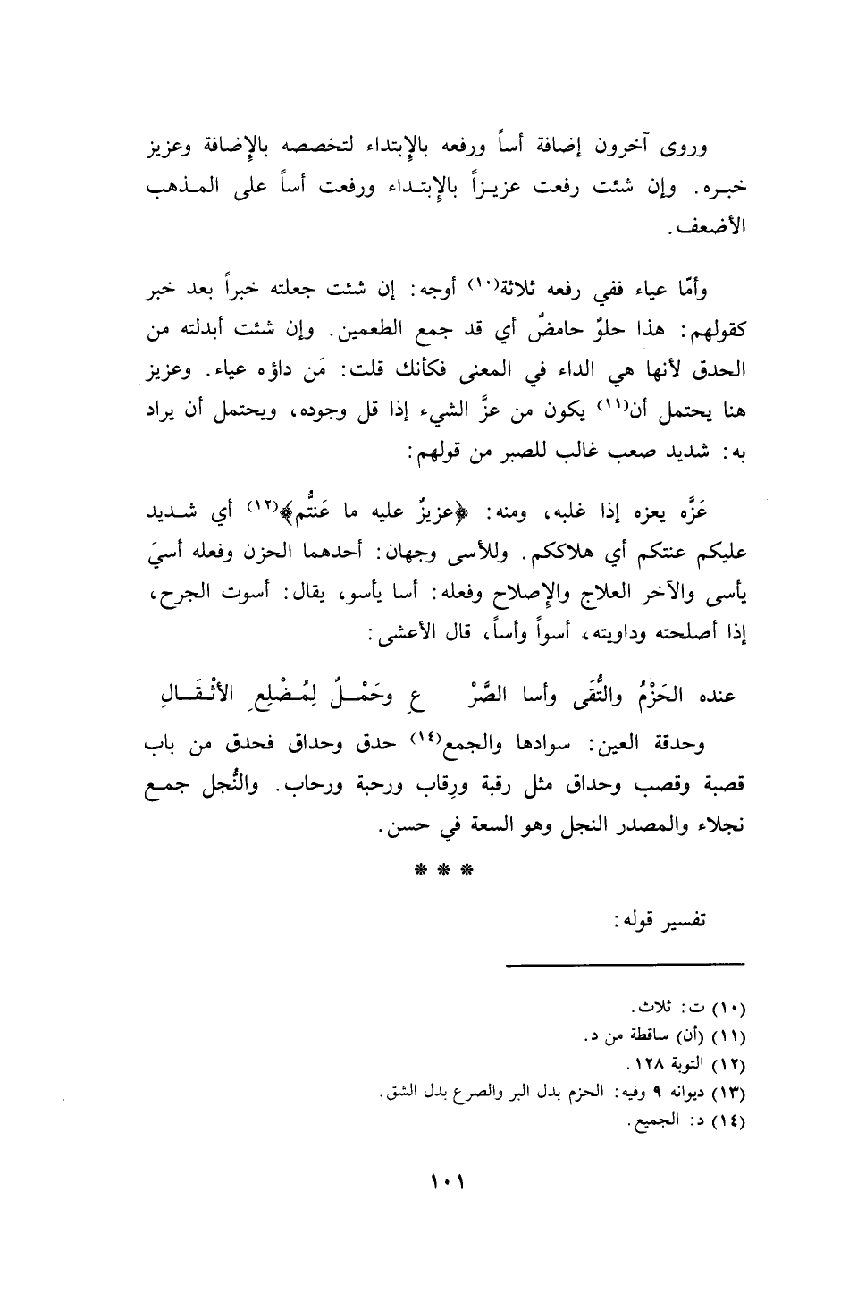 وأما عياء ففي رفعه ثلاثة أوجه: إن شئت جعلته خبراً بعد خبر كقولهم: هذا حلو حامض أي قد جمع الطعمين. وإن شئت أبدلته من الحدق لأنها هي الداء في المعنى فكأنك قلت: من داؤه عياء. وعزيز هنا يحتمل أن يكون من عز الشيء إذا قل وجوده، ويحتمل أن يراد به: شديد صعب غالب للصبر من قولهم: عزه يعزه إذا غلبه، ومنه: (عزيزٌ عليه ما عنتُّم) أي شديد عليكم عنتكم أي هلاككم. وللأسى وجهان: أحدهما الحزن وفعله أسيَ يأسى والآخر العلاج والإصلاح وفعله: أسا يأسو، يقال: أسوت الجرح، إذا أصلحته وداويته، أسواً وأساً، قال الأعشى: