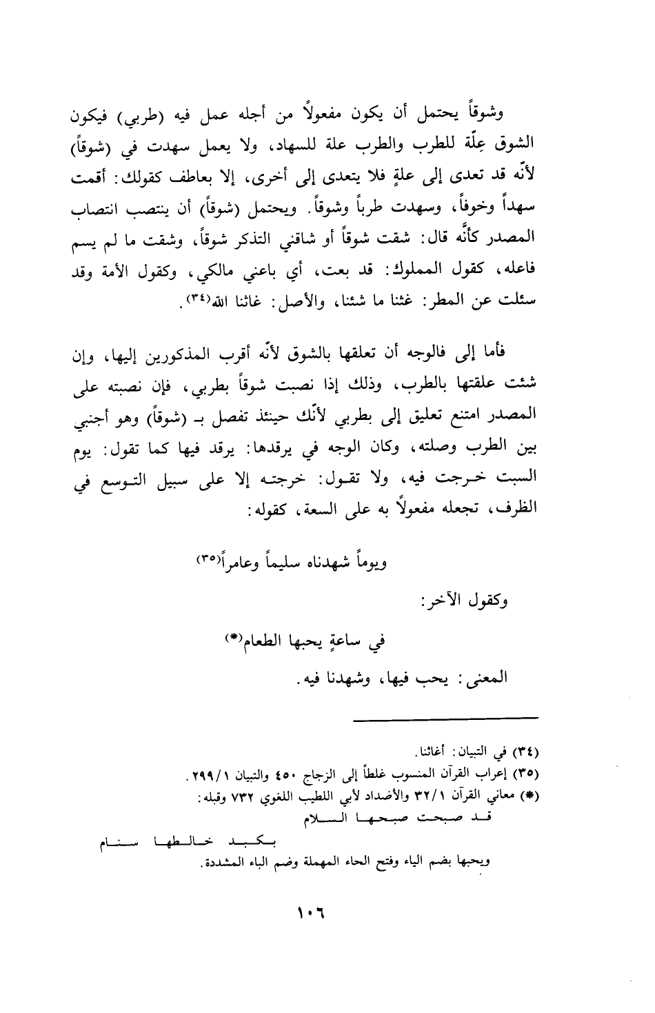وشوقاً يحتمل أيكون مفعولاً من اجله عمل فيه (طربي) فيكون الشوق علة للطرب والطرب علة للسهاد، ولا يعمل سهدت في (شوقاً) لأنه تعدى إلى علة فلا يتعدى إلى أخرى، إلا بعاطف كقولك: أقمت سهداً وخوفاً، وسهدت طرباً وشوقاً. ويحتمل (شوقاً) أن ينتصب انتصاب المصدر كأنه قال: شقت شوقاً أو شاقني التذكر شوقاً، وشقت ما لم يسم فاعله، كقول المملوك: قد بعت، أي باعني مالكي، وكقول الأمة وقد سئلت عن المطر: غثنا ما شئنا، والأصل: غاثنا الله.