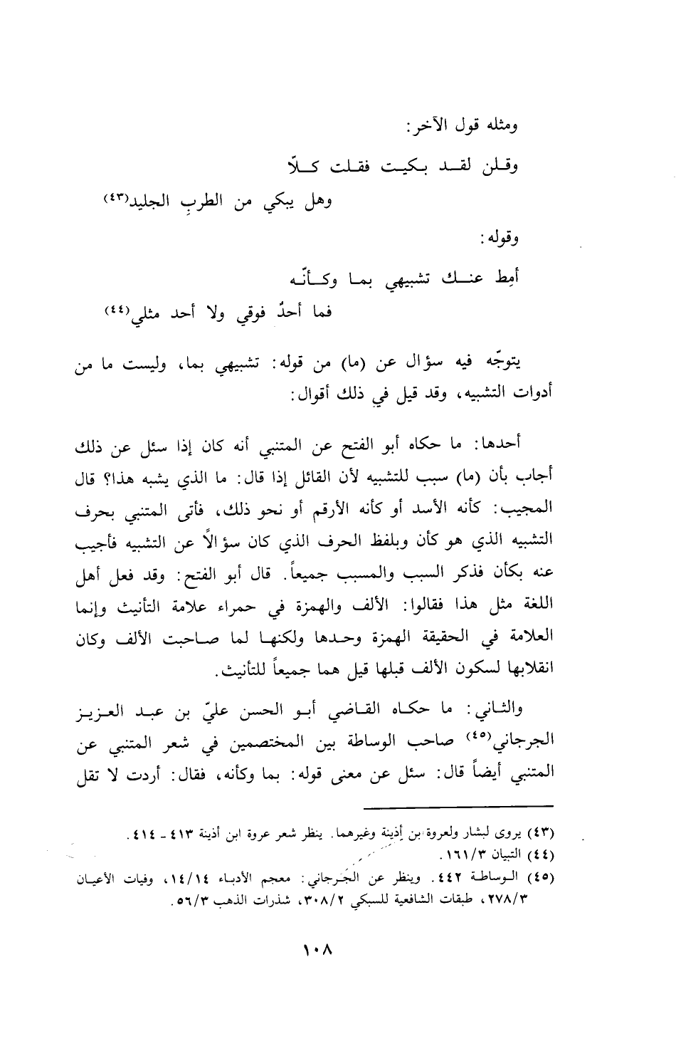والثاني: ما حكاه القاضي أبو الحسن علي بن عبد العزيز الجرجاني صاحب الوساطة بين المختصمين في شعر المتنبي عن المتنبي أيضاً قال: سئل عن معنى قوله: بما وكأنه، فقال: أردت لا تقل