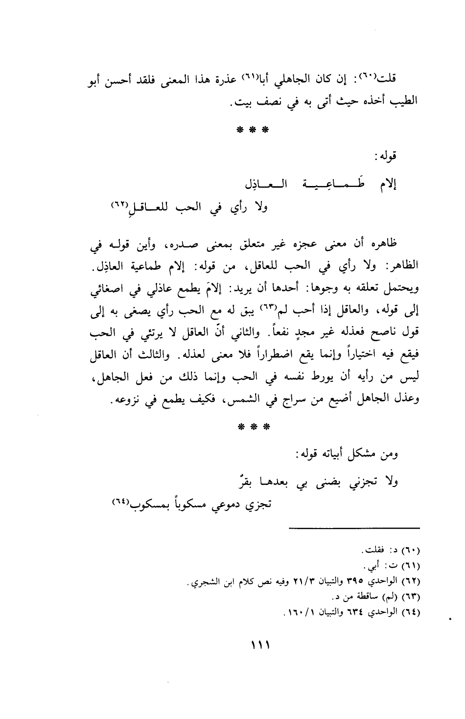ظاهره أن معنى عجزه غير متعلق بمعنى صدره، وأين قوله في الظاهر: ولا في الحب للعاقل، من قوله: إلام طماعية العاذل. ويحتمل تعلقه به وجوها: أحدها أن يريد: إلام يطمع عاذلي في إصغائي إلى قوله، والعاقل إذا أحب لم يبق له مع الحب رأي يصغى به إلى قول ناصح فعذله غير مجد نفعاً. والثاني أن العاقل لا يرتئي في الحب فيقع فيه اختياراً وإنما يقع اضطراراً فلا معنى لعذله. والثالث أن العاقل ليس من رأيه أن يورط نفسه في الحب وغنما ذلك من فعل الجاهل، وعذل الجاهل أضيع من سراج في الشمس، فكيف يطمع في نزوعه.