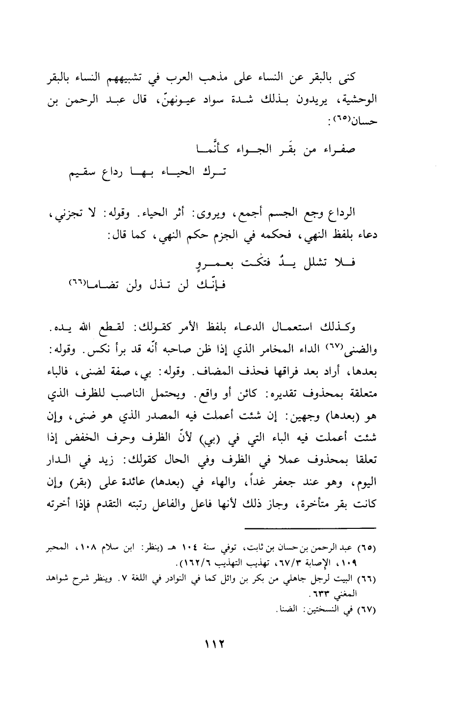 وكذلك استعمال الدعاء بلفظ الأمر كقولك: لقطع الله يده. والضنى الداء المخامر الذي إذا ظن صاحبه أنه قد برأ نكس. وقوله: بعدها، أراد بعد فراقها فحذف المضاف. وقوله: بي، صفة لضنى، فالباء متعلقة بمحذوف تقديره: كائن أو واقع. ويحتمل الناصب للظرف الذي هو (بعدها) وجهين: إن شئت أعملت فيه المصدر الذي هو ضنى، وإن شئت أعملت فيه الباء التي في (بي) لأن الظرف وحرف الخفض إذا تعلقا بمحذوف عملا في الظرف وفي الحال كقولك: زيد في الدار اليوم، وهو عند جعفر غداً، والهاء في (بعدها) عائدة على (بقر) وإن كانت بقر متأخرة، وجاز ذلك لأنها فاعل والفاعل رتبته التقدم فإذا أخرته
