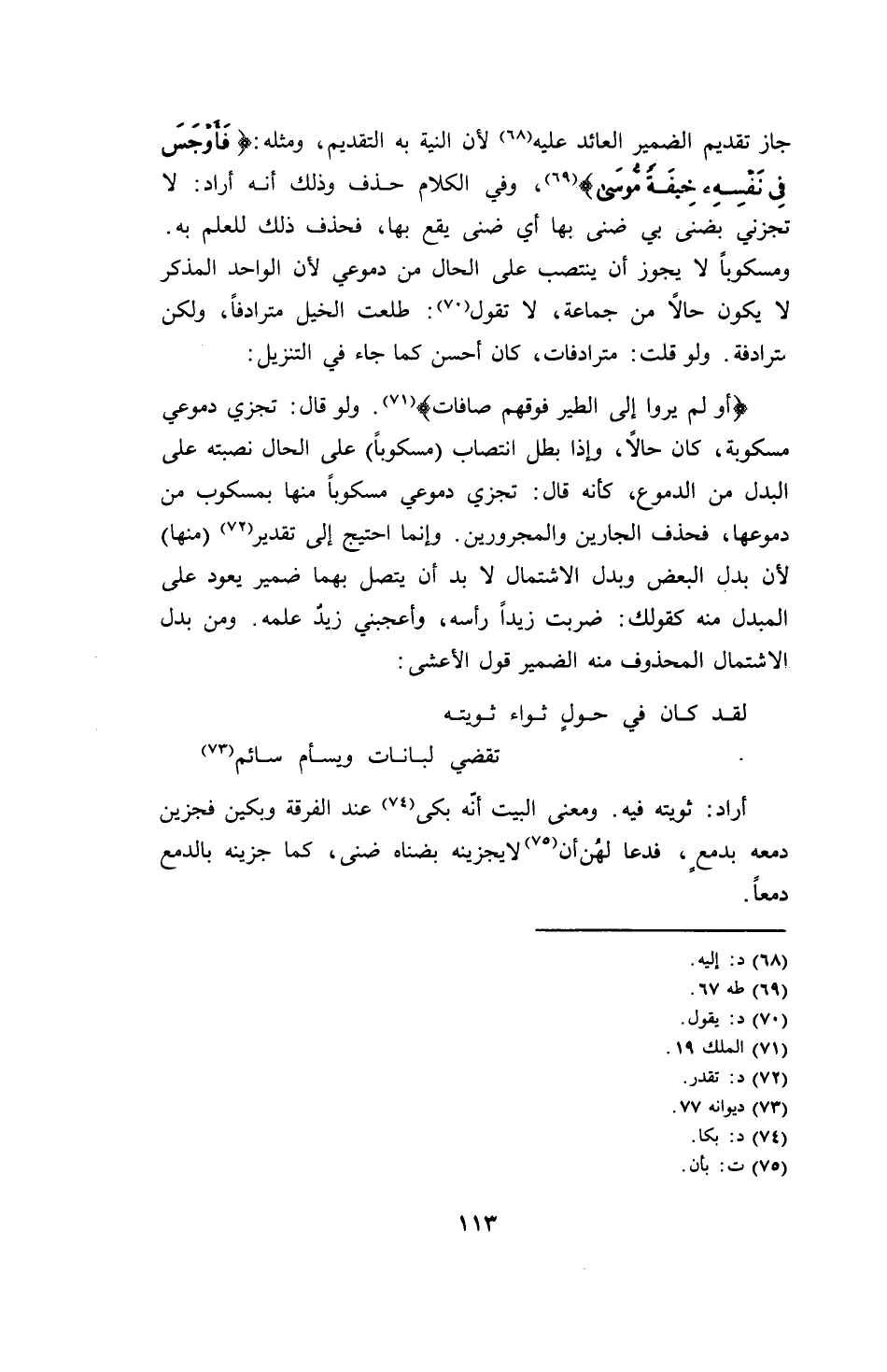 جاز تقديم الضمير العائد عليه لأن النية به التقديم، مثله: (فأوجسَ في نفسهِ خيفةً موسى)، وفي الكلام حذف وذلك أنه أراد: لا تجزني بضنى بي ضنى بها أي ضنى يقع بها، فحذف ذلك للعلم به. ومسكوباً لا يجوز أن ينتصب على الحال من دموعي لأن الواحد المذكر لا يكون حالاً من جماعة، لا تقول: طلعت الخيل مترادفاً، ولكن مترادفة. ولو قلت: مترادفات، كان أحسن كما جاء في التنزيل: (أو لم يروا إلى الطير فوقهم صافات). ولو قال: تجزي دموعي مسكوبة، كان حالاً، وإذا بطل انتصاب (مسكوباً) على الحال نصبته على البدل من الدموع، كأنه قال: تجزي دموعي مسكوباً منها بمسكوب من دموعها، فحذف الجارين والمجرورين. وإنما احتيج إلى تقدير (منها) لأن بدل البعض وبدل الاشتمال لا بد أن يتصل بهما ضمير يعود على المبدل منه كقولك: ضربت زيداً رأسه، وأعجبني زيد علمه. ومن بدل الاشتمال المحذوف منه الضمير قو الأعشى: