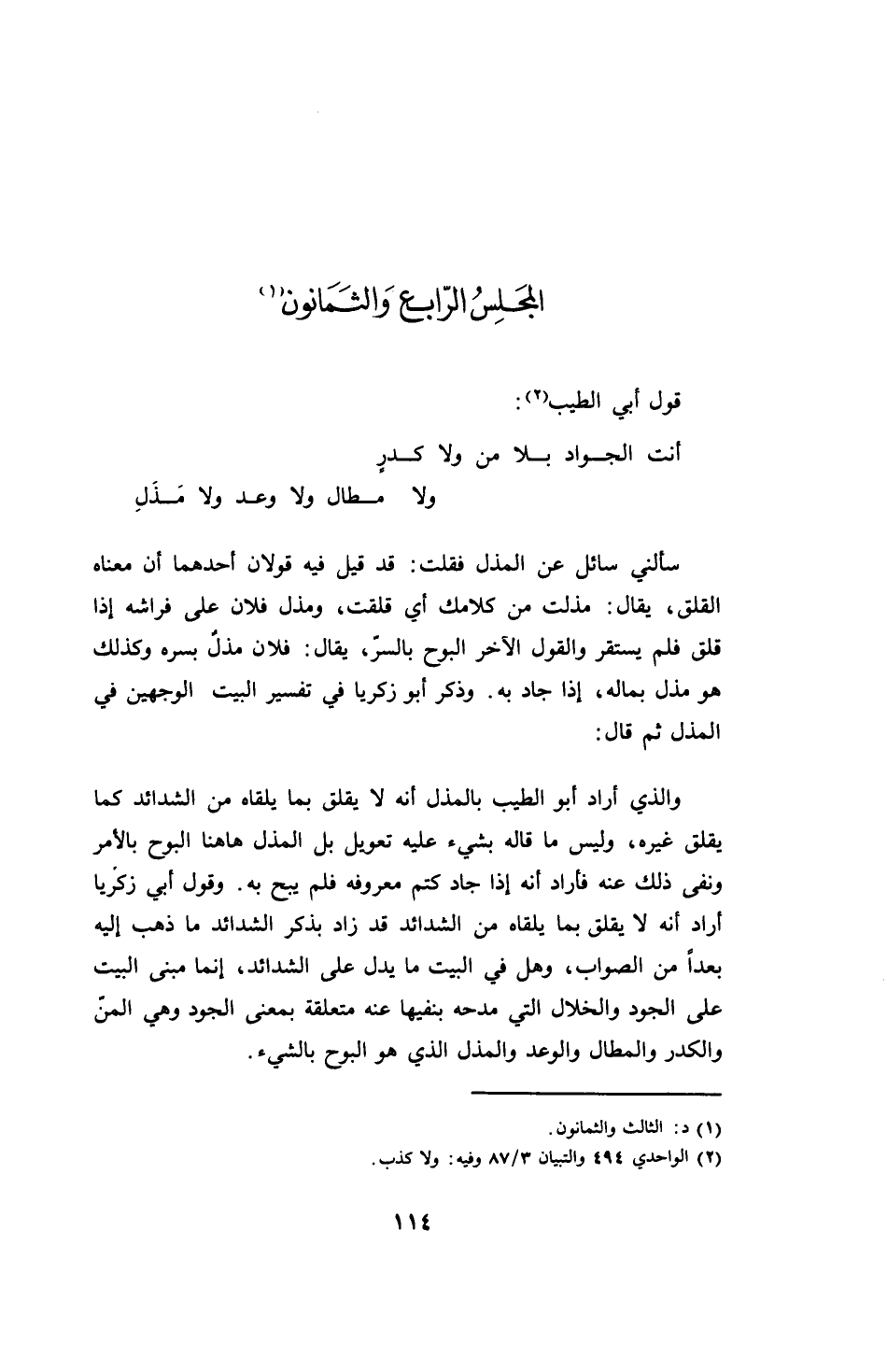 سألني سائل عن المذل فقلت: قد قيل فيه قولان أحدهما أن معناه القلق، يقال: مذلت من كلامك أي قلقت، ومذل فلان على فراشه إذا قلق فلم يستقر والقول الآخر البوح بالسر، يقال: فلان مذل بسره وكذلك هو مذل بماله، إذا جاد به. وذكر أبو زكريا في تفسير البيت الوجهين في المذل ثم قال: والذي أراد أبو الطيب بالمذل أنه لا يقلق بما يلقاه من الشدائد كما يقلق غيره، وليس ما قاله بشيء عليه تعويل بل المذل هاهنا البوح بالأمر ونفى ذلك عنه فأاخرته