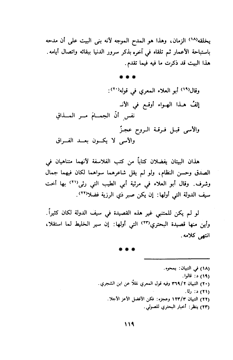 هذان البيتان يفضلان كتاباً من كتب الفلاسفة لأنهما متناهيان في الصدق وحسن النظام، ولو لم يقل شاعرهما سواهما لكان فيهما جمال وشرف. وقال أبو العلاء في مرثية أبي الطيب التي رثى بها أخت سيف الدولة التي أولها: إن يكن صبر ذي الرزية فضلا.