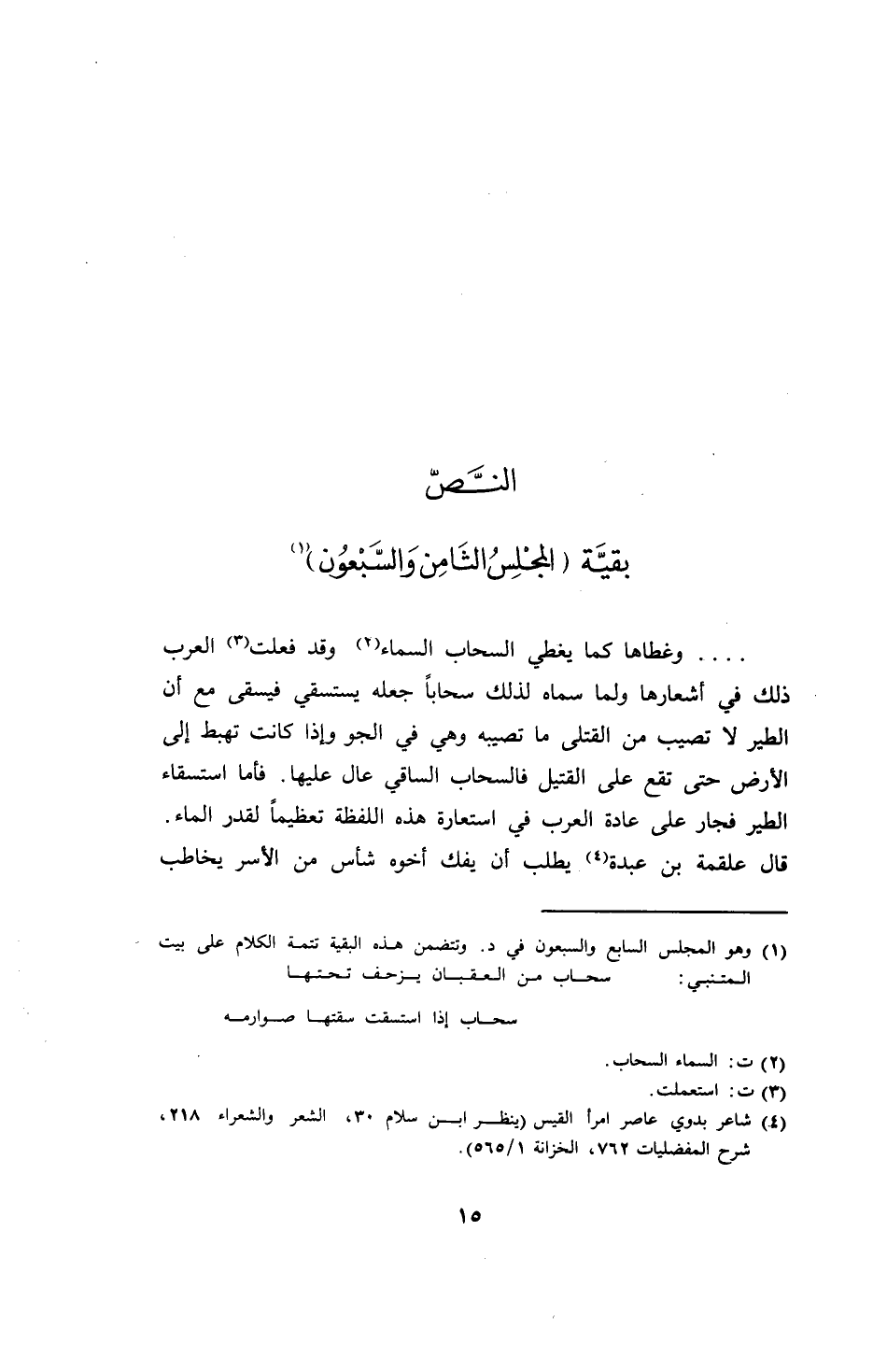 .... وغطاها كما يغطي السحاب السماء وقد فعلت العرب ذلك في أشعارها ولا سماه لذلك سحاباً جعله يستسقي فيسقى مع أن الطير لا تصيب من القتلى ما تصيبه وهي في الجو وإذا كانت تهبط إلى الأرض حتى تقع على القتيل فالسحاب الساقي عال عليها. فأما استسقاء الطير فجار على العرب في استعارة هذه اللفظة تعظيماً لقدر الماء. قال علقمة بن عبدة يطلب أن يفك أخوه شأس من الأسر يخاطب