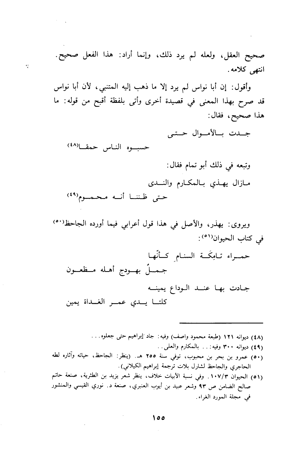 وأقول: إن أبا نواس لم يرد إلا ما ذهب إليه المتنبي، لأن أبا نواس قد صرح بهذا المعنى في قصيدة أخرى وأتى بلفظة أقبح من قوله: ما هذا صحيح، فقال: