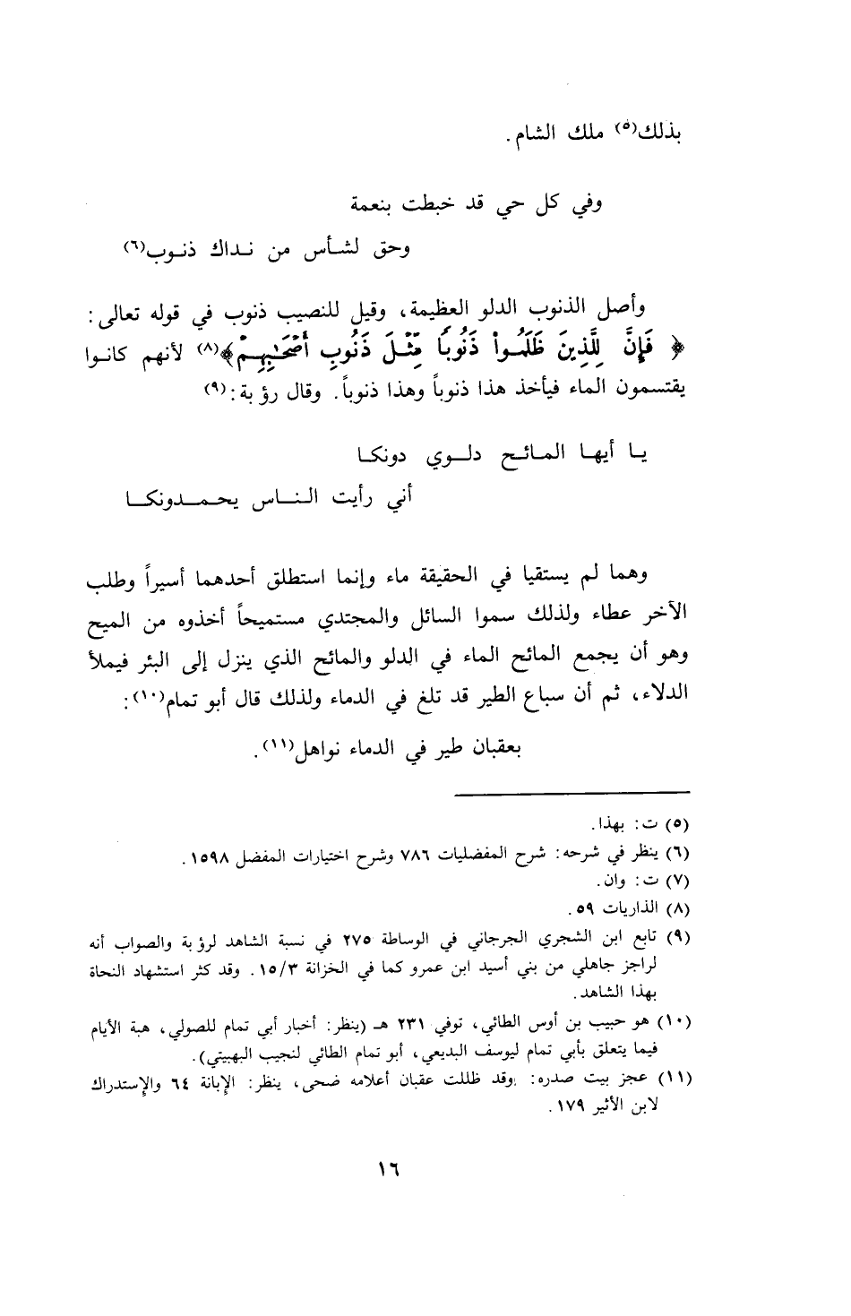 وأصل الذنوب الدلو العظيمة، وقيل للنصيب ذنوب في قوله تعالى: (فإنَّ للَّذينَ ظلموا ذنوباً مثلَ ذنوبِ أصحبهمْ) لأنهم كانوا يقتسمون الماء فيأخذ هذا ذنوباً وهذا ذنوباً. وقال رؤبة: