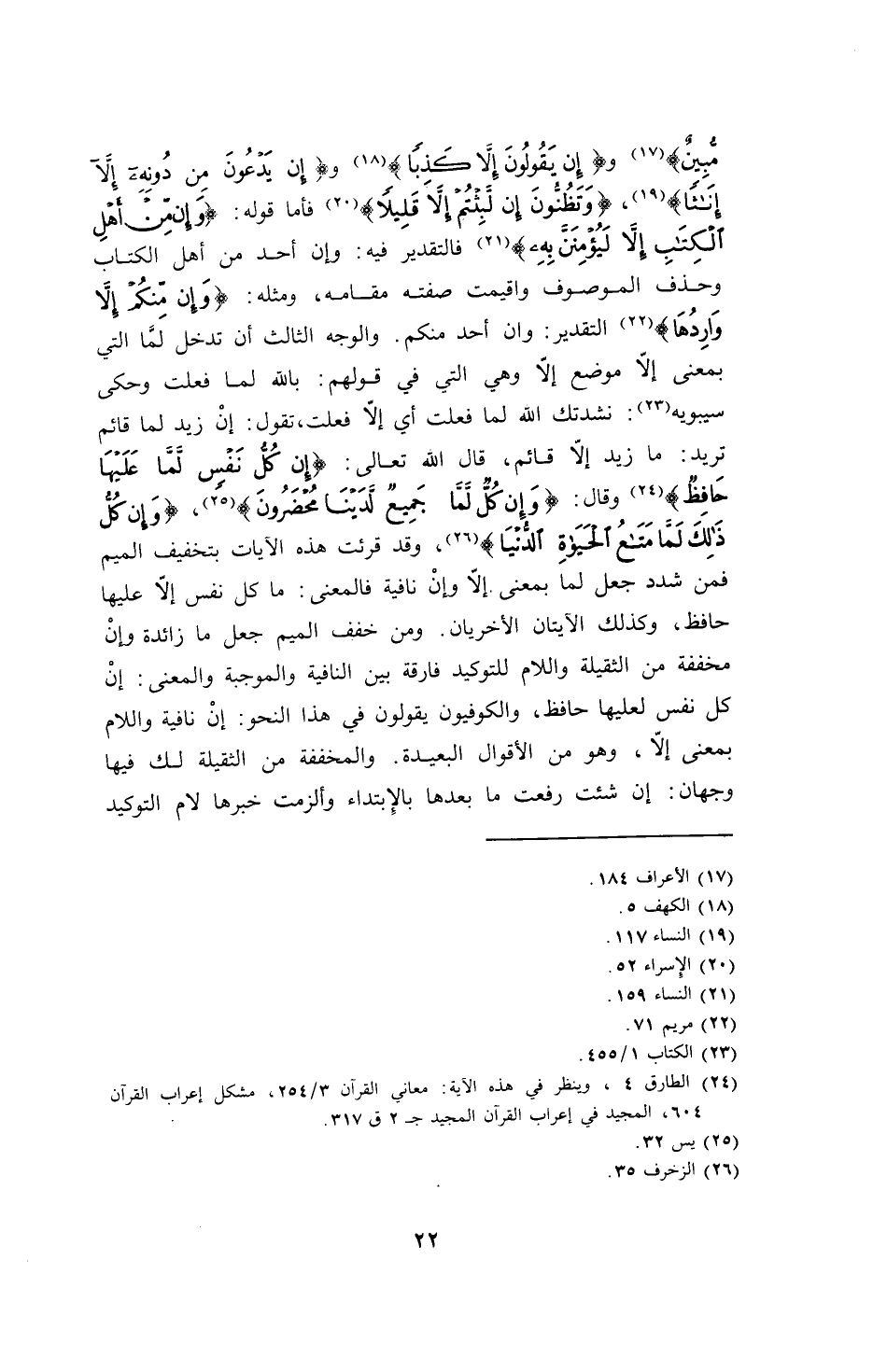 مُّبينٌ) و (إن يقولونَ إلَّا كذباَ) و (إن يدعونَ من دونهِ إلَّا إنثاً)، (وتظنُّونَ إن لبثتمْ إلَّا قليلاً) فأما قوله: (وإنْ منْ أهلِ الكتبِ إلَّا ليؤمننَّ بهِ) فالتقدير فيه: وإن أحد من أهل الكتاب وحذف الموصوف وأقيمت صفته مقامه، ومثله: (وإن منكمْ إلَّا واردها) التقدير: وإن أدح منكم. والوجه الثالث أن تدخل لما التي بنعنى إلا موضع إلا وهي التي في قولهم: بالله لما فعلت أي إلا فعلت، تقول: إن زيد لما قائم تريد: ما زيد إلا قائم، قال الله تعالى: (إن كلُّ نفسٍ لَّمَّا عليها حافظٌ) وقال: (إن كلٌّ لَّمَّا جميعٌ لدينا محضرونَ)، (وإن كلُّ ذلكَ لمَّا متعُ الحيوةِ الدُّنيا)، وقد قرئت هذه الآيات بتخفيف الميم فمن شدد جعل لما بمعنى إلا وإن نافية فالمعنى: ما كل نفس إلا عليها حافظ، وكذلك الآيتان الأخريان. ومن خفف الميم جعل ما زائدة وإن مخففة من الثقيلة واللام للتوكيد فارقة بين النافية والموجبة والمعنى: إن كل نفس لعليها حافظ، والكوفيون يقولون في هذا النحو: إن نافية واللام بمعنى إلا، وهو من الأقوال البعيدة. والمخففة من الثقيلة لك فيها وجهان: إن شئت رفعت ما بعدها بالابتداء وألزمت خبرها لام التوكيد