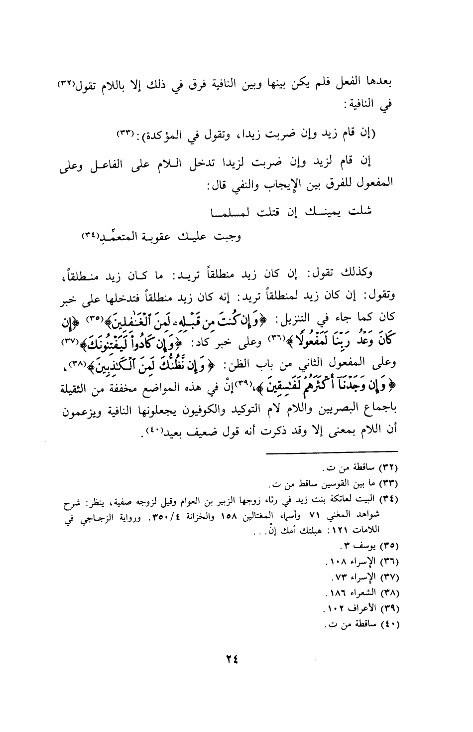 وكذلك تقول: إن كان زيد منطلقاً تريد: ما كان زيد منطلقاً، وتقول: إن كان لمنطلقاً تريد: إنه كان زيد منطلقاً فتدخلها على خبر كان كما جاء في التنزيل: (وإن كنتَ من قبلهِ لمنَ الغافلين) (إن كانَ وعدُ ربّنا لمفعولاً) وعلى خبر كاد: (وإن كادوا ليفتنوكَ) وعلى المفعول الثاني من باب الظن: (وإن نَّظنُّكَ لمنَ الكاذبينَ)، (وإن وجدنا أكثرهمْ لفاسقينَ)، إن في هذه المواضع مخففة من الثقيلة بإجماع البصريين واللام لا الوي والكوفيون يجعلنها النافية ويزعمون أن اللام بمعنى إلا وقد ذكرت انه قول ضعيف بعيد.