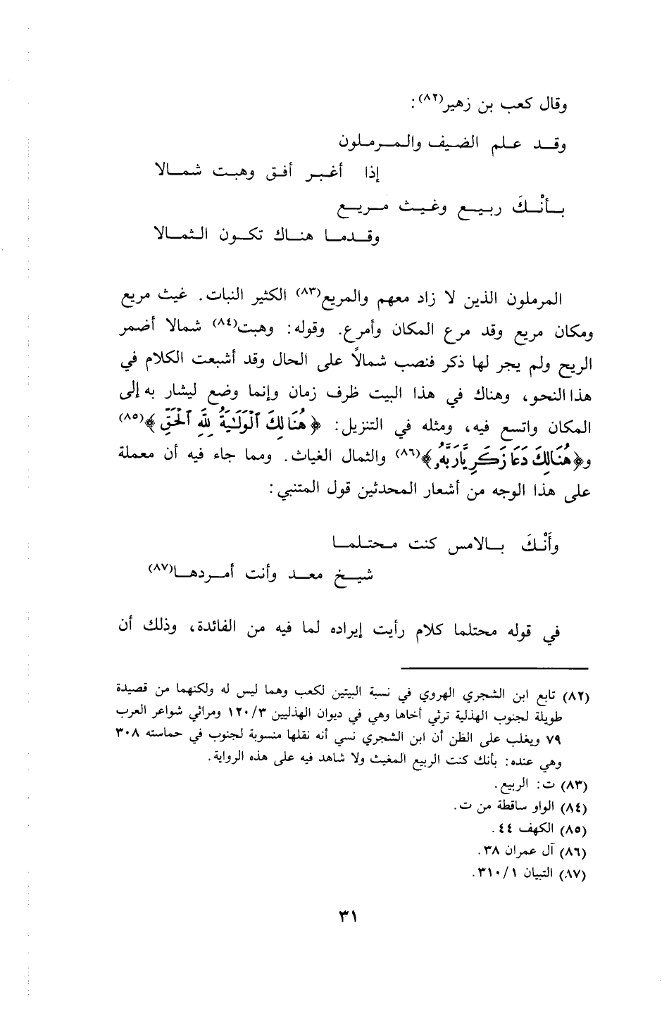 المرملون الذين لا زاد معهم والمريع الكثير النبات. غيث مريع ومكان مريع وقد مرع المكان امرع. وهبت شمالا أضمر الريح ولم يجر لها ذكر فنصب شمالاً على الحال وقد أشبعت الكلام في هذا النحو، وهناك في هذا البيت ظرف زمان وإنما وضع ليشار به إلى المكان واتسع فيه، ومثله في التنزيل: (هنا لكَ الواليةُ للهِ الحقِّ) و (هنالكَ دعا زكريَّا ربَّهُ) والثمال الغيث. ومما جاء فيه أن معملة على هذا الوجه من أشعار المحدثين قول المتنبي: