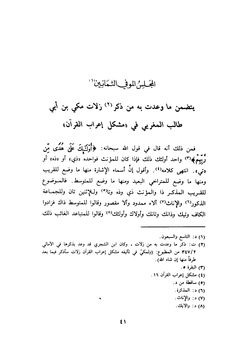 فمن ذلك أنه قال في قول الله سبحانه: (أولئكَ على هدًى منْ ربِّهمْ) واحد أولئك ذلك فإذا كان للمؤنث فواحده "ذي" أو "ذه" أو "تي". انتهى كلامه. وأقول إن أسماء الإشارة منها ما وضع للقريب ومنها ما وضع للمتراخي البعيد ومنها ما وضع للمتوسط. فالموضوع لقريب المذكر ذا والمؤنث ذي وذه وتا وللإثنين تان وللجماعة الذكور والإناث ألاء ممدود وألا مقصور وقالوا للمتوسط ذاك فزادوا الكاف وتيك ذانك وتانك واولاك وأولئك وقالوا للمتباعد الغائب ذلك