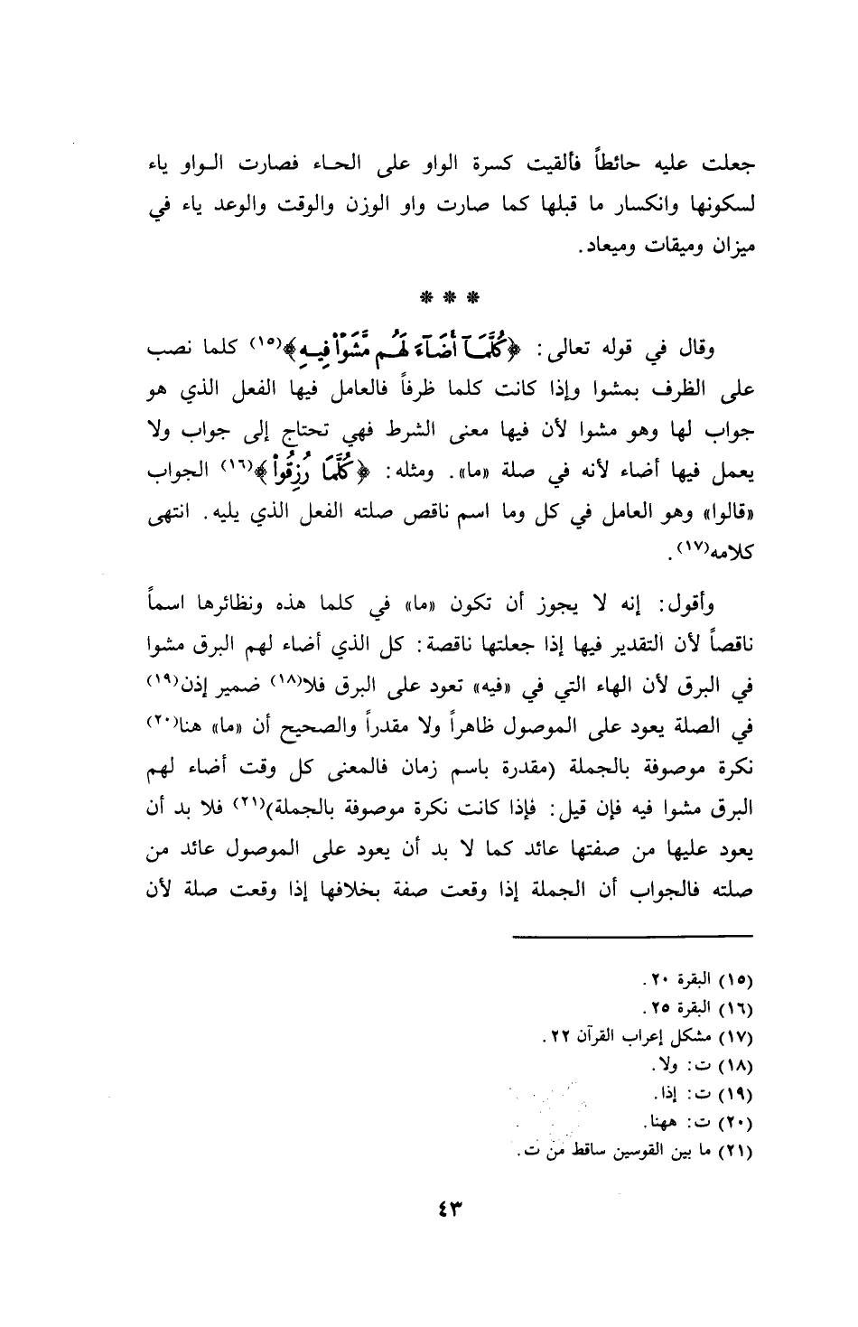 وأقول: إنه لا يجوز أن تكون "ما" في كلما هذه ونظائرهما اسماً ناقصاً لأن التقدير فيها إذا جعلتها ناقصة: كل الذي أضاء لهم البرق مشوا في البرق لأن الهاء التي في "فيه" تعود على البرق فلا ضمير إذن في الصلة يعود على الموصول ظاهراً ولا مقدراً والصحيح أن "ما" هنا نكرة موصوفة بالجملة (مقدرة باسم زمان فالمعنى كل وقت أضاء لهم البرق مشوا فيه فإن قيل: فإذا كانت نكرة موصوفة بالجملة) فلا بد أن يعود عليها من صفتها عائد كما لابد أن يعود على الموصول عائد من صلته فالجواب أن الجملة إذا وقعت صفة بخلافها إذا وقعت صلة لأن