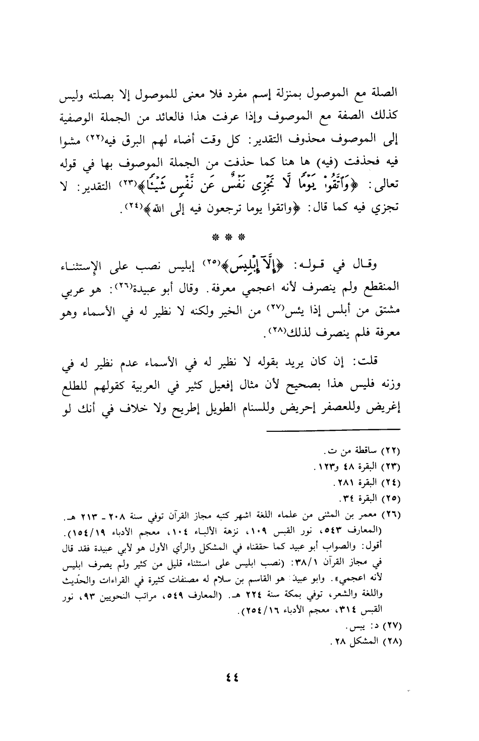 وقال في قوله: (إلَّا إبليسَ) إبليس نصب على الاستثناء المنقطع ولم ينصرف لأنه أعجمي معرفة. وقال أبو عبيدة: هو عربي مشتق من أبلس إذا يئس من الخير ولكنه لا نظير له في الأسماء وهو معرفة فلم ينصرف لذلك.