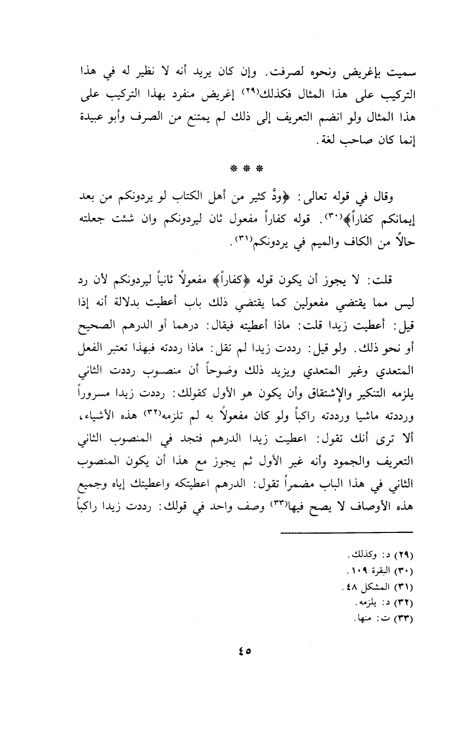 قلت: لا يجوز أن يكون قوله (كفاراً) مفعولاً ثانياً ليردونكم لأن رد ليس مما يقتضي مفعولين كما يقتضي مفعولين كما يقتضي ذلك باب أعطيت بدلالة أنه إذا قيل: أعطيت زيدا قلت: ماذا أعطيته فيقال: درها أو الدرهم الصحيح أو نحو ذلك. ولو قيل: ردت زيدا لم تقل: ماذا رددته فبهذا تعتبر الفعل المتعدي وغير المتعدي ويزيد ذلك وضوحاً أن منصوب رددت الثاني يلزمه التنكير والإشقاق وأن يكون هو الأول كقولك: رددت زيدا مسروراً ورددته ماشيا ورددته راكباً ولو كان مفعولاً به لم تلزمه هذه الأشياء، ألا ترى أنك تقول: أعطيت زيدا الدرهم فتجد في المنصوب الثاني التعريف والجمود وأنه غير الألو ثم يجوز مع هذا أن يكون المنصوب الثاني في هذا الباب مضمراً تقول: الدرهم أعطيته وأعطيتك إياه وجميع هذه الأوصاف لا يصح فيها وصف واحد في قولك: رددت زيدا راكباً