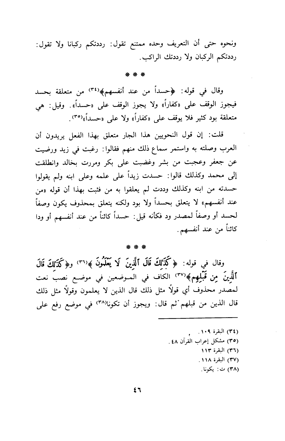 وقال في قوله: (حسداً من عند أنفسهم) من متعلقة بحسد فيجوز الوقف على "كفاراً" ولا على "حسداً".