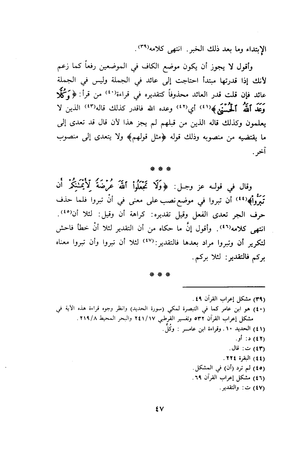 وقال في قوله عز وجل: (ولا تجعلواْ اللهَ عرضةً لأيمانكمْ أن تبرُّواْ) أن تبروا في موضع نصب على معنى في أن تبروا فلما حذف حرف الجر تعدى الفعل وقيل تقديره: كراهة أن وقيل: لئلا أن. انتهى كلامه. وأقول إن ما حكاه من أن التقدير لئلا أن خطأ فاحش لتكرير أن تبروا مراد بعدها فالتقدير: لئلا أن تبروا وأمن تبروا وأن تبروا معناه بركم فالتقدير: لئلا بركم.