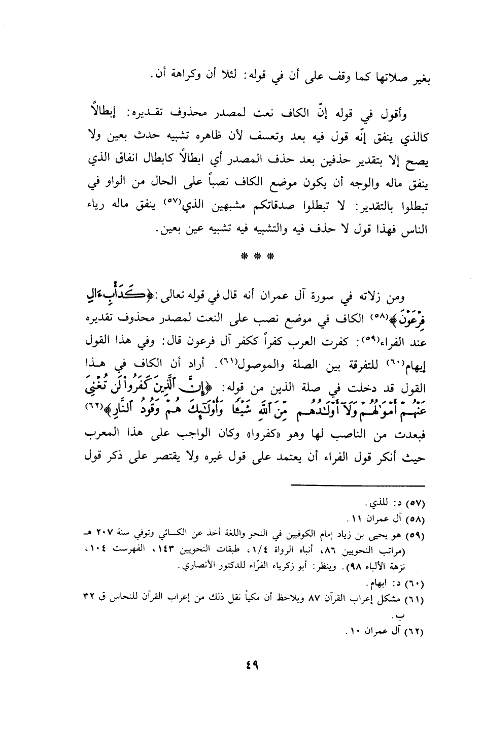 ومن زلاته في سمرة آل عمران أنه قال في قوله تعالى: (كدأبِ آلِ فرعونَ) الكاف في موضع نصب على النعت لمصدر محذوف تقديره عند الفراء: كفرت العرب كفراً ككفر آل فرعون قال: وفي هذا القول إيهام للتفرقة بين الصلة والموصول. أراد أن الكاف في هذا القول قد دخلت في صلة الذين من قوله: (إنَّ الَّذينَ كفرواْ لن تغنيَ عنهمْ أموالهمْ ولا أولادهمْ منَ اللهِ شيئاً وأولئكَ همْ وقودُ النَّارِ) فبعدت من الناصب لها وهو "كفروا" وكان الواجب على هذا المعرب حيث أنكر قول الفراء أن يعتمد على قول غيره ولا يقتصر على ذكر قول