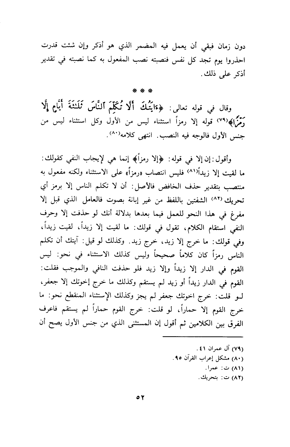 وقال قوله تعالى: (آيتكَ ألَّا تكلمَ الناسَ ثلاثةَ أيَّامٍ إلا رمزاً) قوله إلا رمزاً استثناء ليس من الأول وكل استثناء ليس من جنس الأول فالوجه في النصب. انتهى كلامه.