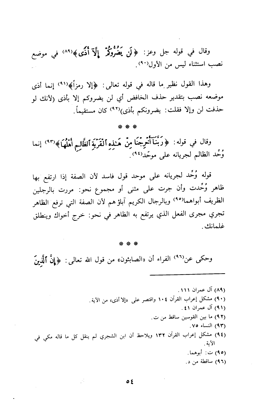 وهذا القول النظير ما قاله في قوله تعالى: (إلا رمزاً) إنما أذى موضعه نصب بتقدير حذف الخافض أي لن يضروكم إلا بأذى (لأنك لو حذفت لن وإلا فقلت: يضروكم بأذى) كان مستقيماً.