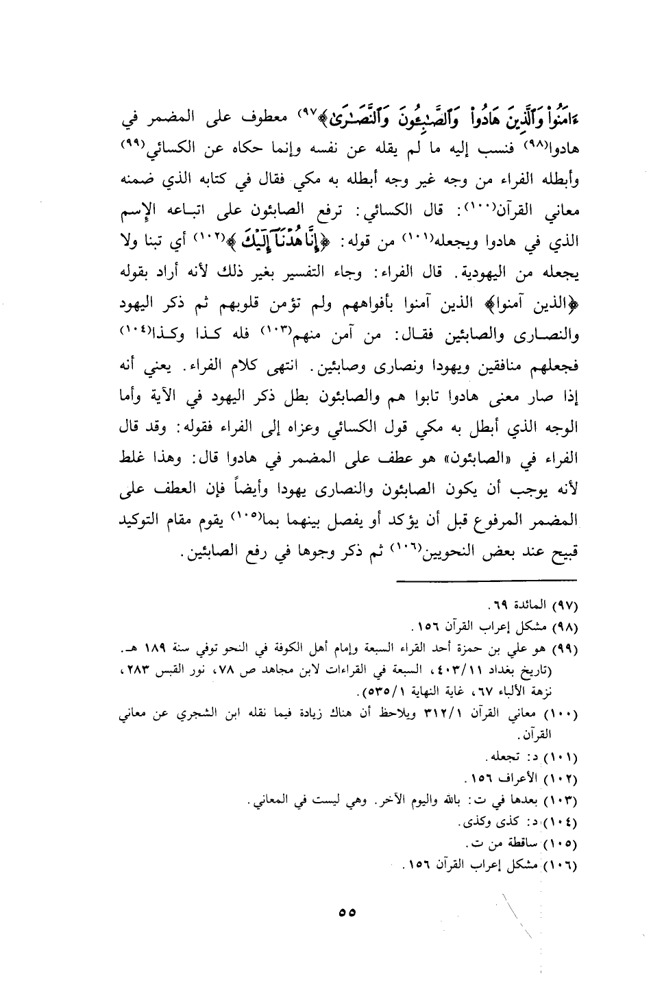 آمنواْ والَّذينَ هادواْ والصَّابئونَ والنَّصارى) معطوف على المضمر في هادا فنسب إليه ما لم يقله عن نفسه وإنما حكاه عن الكسائي وأبطله الفراء من وجه أبطله مكي فقال في كتابه الذي ضمنه معاني القرآن: قال الكسائي: ترفع الصابئون على اتباعه الإسم الذي في هادوا ويجعله من قوله: (إنَّا هدنا إليكَ) أي تبنا ولا يجعله من اليهودية. قال الفراء: وجاء التفسير بغير ذلك لأنه أراد بقوله (الذين آمنوا) الذين آمنوا بأفواههم ولم تؤمن قلوبهم ثم ذكر اليهود والنصارى والصابئين فقال: من آمن منهم فله كذا وكذا فجعلهم منافقين ويهودا ونصارى وصابئين. انتهى كلام الفراء. يعني أنه إذا صار معنى هادوا تابوا هم والصابئون بطل ذكر اليهود في الآية وأما الوجه الذي أبطل به مكي قول الكسائي وعزاه إلى الفراء فقوله: وقد قال الفراء في "الصابئون" هو عكف على المضمر في هادوا قال: وهذا غلط لأنه يوجب أن يكون الصابئون والنصارى يهوداً وأيضاً فإن العطف على المضمر المرفوع قبل أن يؤكد أو يفصل بينهما بما يقوم مقام التوكيد قبيح عند بعض النحويين ثم ذكر وجوها في رفع الصابئين.