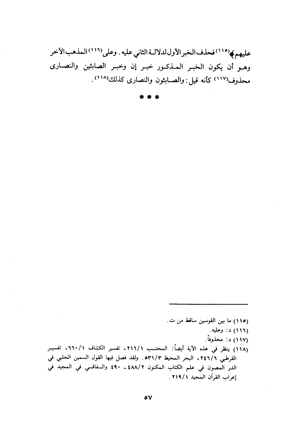 عليهم) فحذف الخبر الأول لدلالة الثاني عليه. وعلى المذهب الآخر وهو أن يكون الخبر المذكور خبر وإن وخبر الصابئين والنصارى محذوف كأنه قيل: والصابئون والنصارى كذلك.