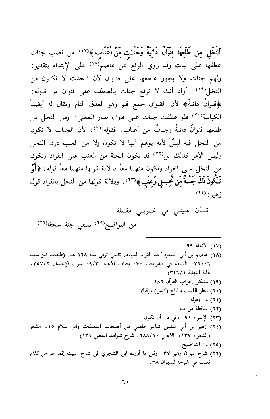 النَّخلِ من طلعها قنوانٌ دانيةٌ وجنَّاتٍ منْ أعنابٍ) من نصب جنات عطفها على نبات وقد روي الرفع عن عاصم على الابتداء بتقدير: لهم جنات ولا يجوز عطفها على قنوان لأن الجنات لا تكون من النخل. أراد أنك لا ترفع جنات بالعطف على قنوان من قوله: (قنوان دانية) لأن القنوان جمع قنو وهو العذق التام ويقال له أيضاً الكباسة فلو عطفت جنات على قنوان صار المعنى: ومن النخل لا تكون من النخل فيه لبس لأنه يوهم أنها لا تكون إلا من العنب دون النخل وليس الأمر كذلك بل قد تكون الجنة من العنب على انفراد وتكون من النخل على انفراد وتكون منهما معاً فدلالة كونها منهما معاً قوله: (أوْ تكونَ لكَ جنَّةٌ من نَّخيلٍ وعنبٍ). ودلالة كونها من الخل بانفراد قول زهير: