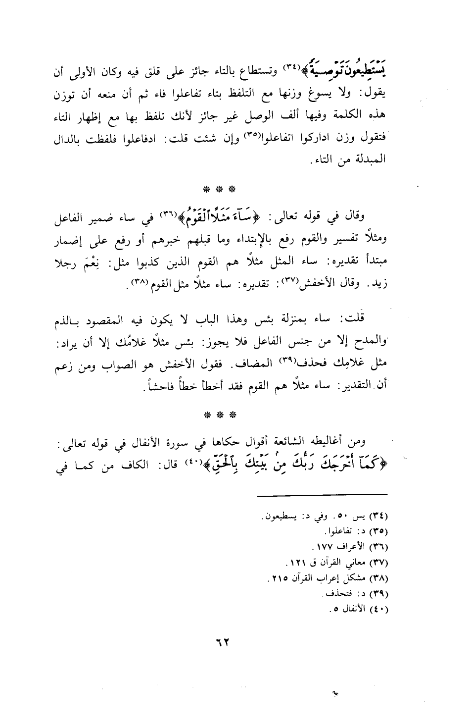 ومن أغاليطه الشائعة أقوال حكاها في سورة الأنفال في قوله تعالى: (كما أخرجكَ ربُّكَ من بيتكَ بالحقِّ) قال: الكاف من كما في
