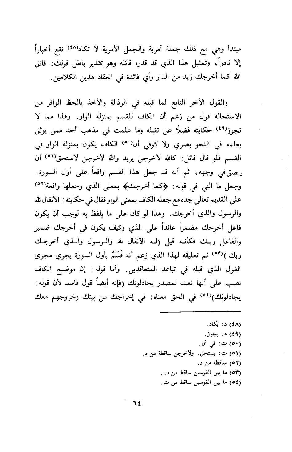 والقول الآخر التابع لما قبله في الرذالة والآخذ بالحظ الوافر من الاستحالة قول من زعم أن الكاف للقسم بمنزلة الواو. وهذا مما لا تجوز حكايته فضلاً عن تقبله وما علمت في مذهب أحد ممن يوثق بعلمه في النحو بصري ولا كوفي أن الكاف يكون بمنزلة الواو في القسم فلو قال قائل: كالله لأخرجن يريد والله لأخرجن لاستحق أن يبصق في وجهه، ثم أنه قد جعل هذا القسم واقعاً على أول السورة. وجعل ما التي في قوله: (كما أخرجك) بمعنى الواو فقال في حكايته: الأنفال لله والرسول والذي أخرجك. وذا لو كان على ما يلفظ به لوجب أن يكون فاعل أخرجك مضمراً عائداً على الذي وكيف يكون في أخرجك ضمراً عائداً على الذي وكيف يكون في أخرجك ضمير والفاعل ربك فكأنه قيل (له الأنفال لله والرسول والذي أخرجك ربك) ثم تعليقه لهذا الذي زعم أنه قسم بأول السورة يجري مجرى القول الذي قبله في تباعد المتعاقدين. وأما قوله: إن موضع الكاف نصب على أنها نعت لمصدر يجادلونك (فإنه أيضاً قول فاسد لأن قوله: يجادلونك) في الحق معناه: في إخراجك من بيتك وخروجهم معك