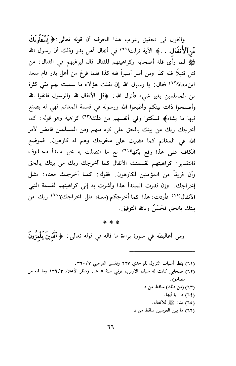 والقول في تحقيق إعراب هذا الحرف أن قوله تعالى: (يسألونكَ عنِ الأنفالِ) الآية في أنفال أهل بدر وذلك أن رسول الله صلى الله عليه وسلم لما رأى قلة أصحابه وكراهيتهم للقتال قال ليرغبهم في القتال: من قتل قتيلاً فله كذا ومن أسر أسيراً فله كذا فما فرغ من أهل بدر قام سعد ابن معاذ فقال: يا رسول الله إن نفلت هؤلاء ما سميت لهم بقي كثرة من المسلمين بغير شيء فأنزل الله: (قل الأنفال لله والرسول فاتقوا الله وأصلحوا ذات بينكم وأطيعوا الله ورسوله في قسمة المغانم فهي له يصنع فيها ما يشاء) فسكتوا وفي أنفسهم من ذلك كراهية وهو قوله: كما أخرجك ربك من بيتك بالحق على كره منهم ومن المسلمين فامض لأمر الله في المغانم كما مضيت على مخرجك وهم له كارهون. فموضع الكاف على هذا رفع بأنها مع ما اتصلت به خبر مبتدأ محذوف فالتقدير: كراهيتهم لقسمتك الأنفال كما أخرجك ربك من بيتك بالحق وأن فريقاً من المؤمنين لكارهون. فقوله: كما أخرجك معناه: مثل إخراجك. وإن قدرت المبتدأ هذا وأشرت به إلى كراهيتهم لقسمة النبي الأنفال فأردت: هذا لكما أخرجكم (معناه مثل إخراجك) ربك من بيتك بالحق فحسن وبالله التوفيق.